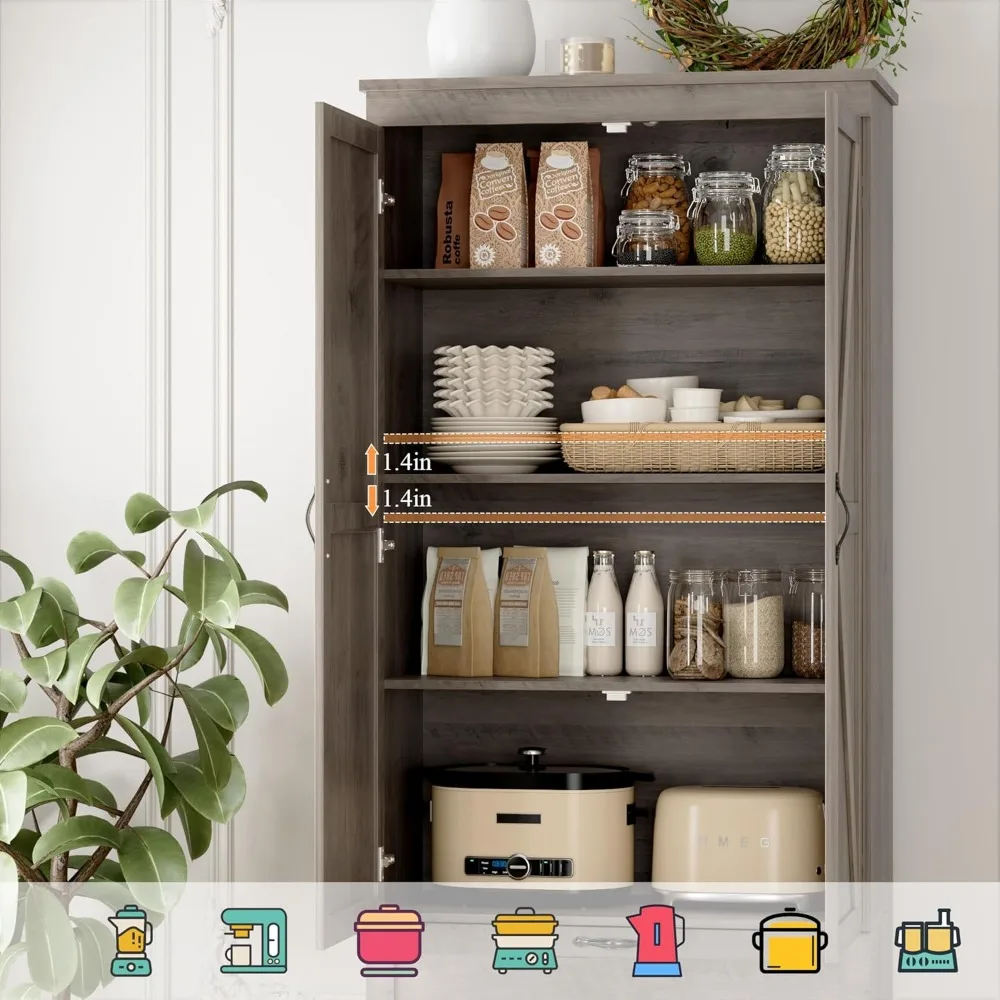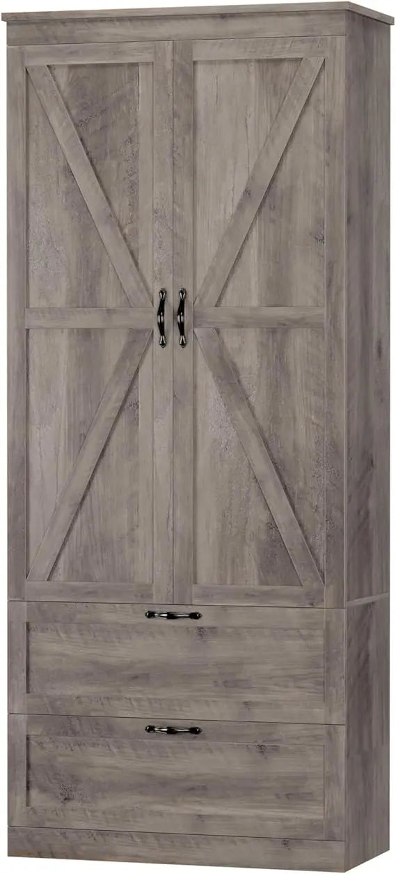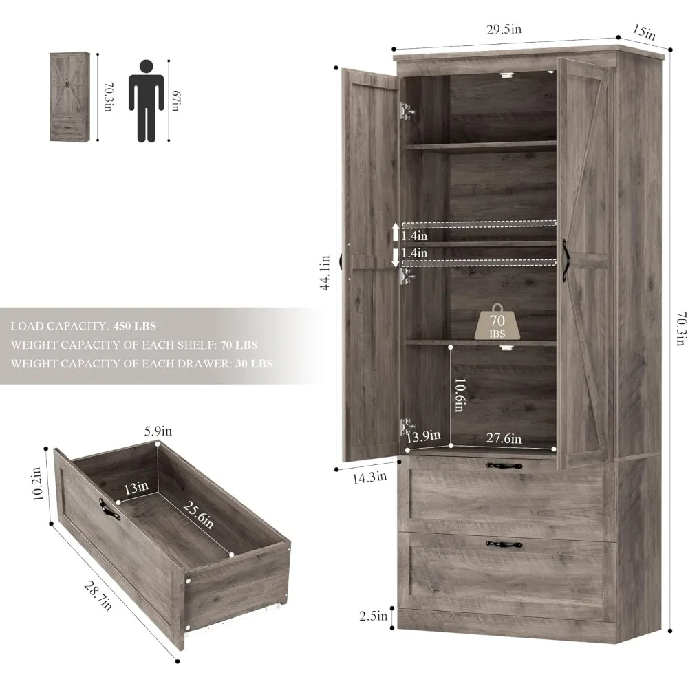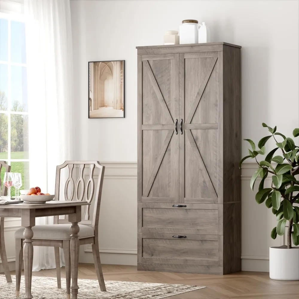 70-inch Tall Kitchen Pantry Cabinet with Barn Doors, Drawers, and Adjustable Shelves - Modern Farmhouse Style Storage
