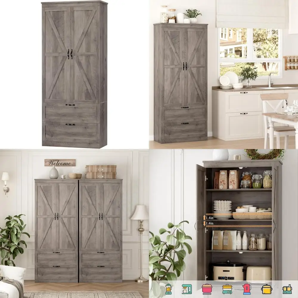 This item is a spacious storage cabinet designed to accommodate a variety of items in different sizes. It features a large double-door cabinet with two fixed shelves and an adjustable shelf, allowing for customization of storage space. Additionally, it includes two large drawers for extra storage needs. The cabinet's aesthetically pleasing design makes it versatile for use in various settings such as living rooms, studies, kitchens, dining rooms, and bathrooms. The cabinet has a modern farmhouse charm with a wood-like texture finish, barn-style doors, and classic black metal handles shaped like flowers, creating a warm and inviting atmosphere. It serves as an impressive focal point in any space. Constructed from high-quality manufactured wood and boasting a solid structure, this tall storage cabinet offers excellent stability and durability for long-term use. Its overall dimensions are 14.9 inches deep by 29.5 inches wide by 70.3 inches high, with a weight capacity of 450 lbs. The kitchen storage cabinet comes with detailed instructions and labeled parts, making assembly a breeze.
