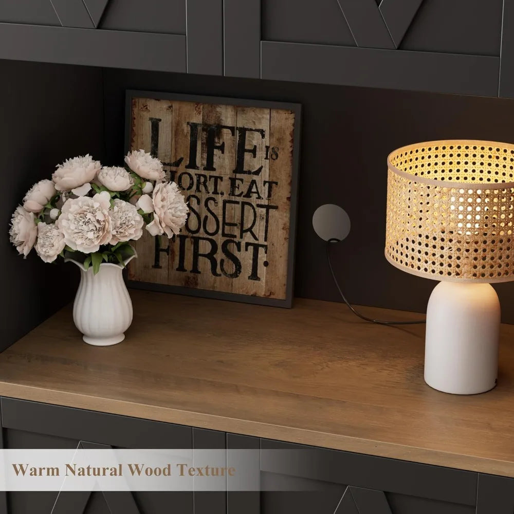 This kitchen pantry cabinet offers ample storage with 8 fully enclosed compartments, each with a door, providing a tidy space to organize kitchen supplies for convenient access. It features two separate countertops that allow for the simultaneous use of a microwave and coffee maker without taking up too much space. The cabinet's versatility makes it suitable for various rooms in your home. It can be used in the kitchen for easy access to ingredients, in the dining room to display cutlery and serve as a buffet station during events, or in the living room as a storage cabinet for snacks and other essentials. With a modern farmhouse aesthetic, the pantry cabinet features a rustic brown top and a black body, adorned with intricate diamond patterns on the doors that add a unique texture. This makes it a striking piece that can blend seamlessly into a modern farmhouse-inspired decor. Constructed from high-quality engineered wood, the pantry cabinet is durable and sturdy, equipped with a strong base and an anti-tipping device for excellent stability. All doors are fitted with a buffer hinge that closes slowly and smoothly with a gentle push. The cabinet measures 16 inches in depth, 55 inches in width, and 71 inches in height. Assembly is straightforward, with clear instructions, part numbers, and illustrations provided for each step. Due to the size of the cabinet, it is recommended that two adults work together during assembly. Please note that the cabinet will arrive in two separate packages for ease of delivery and setup.