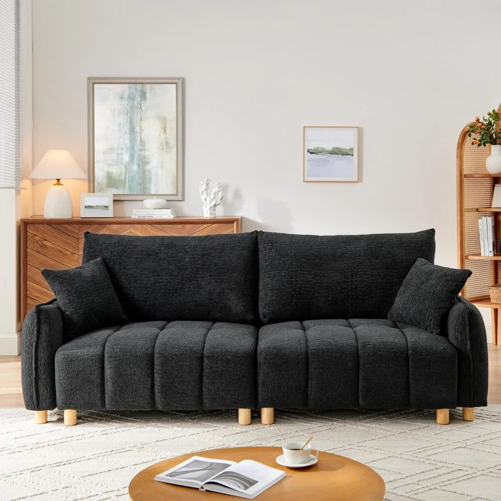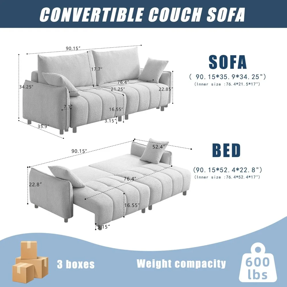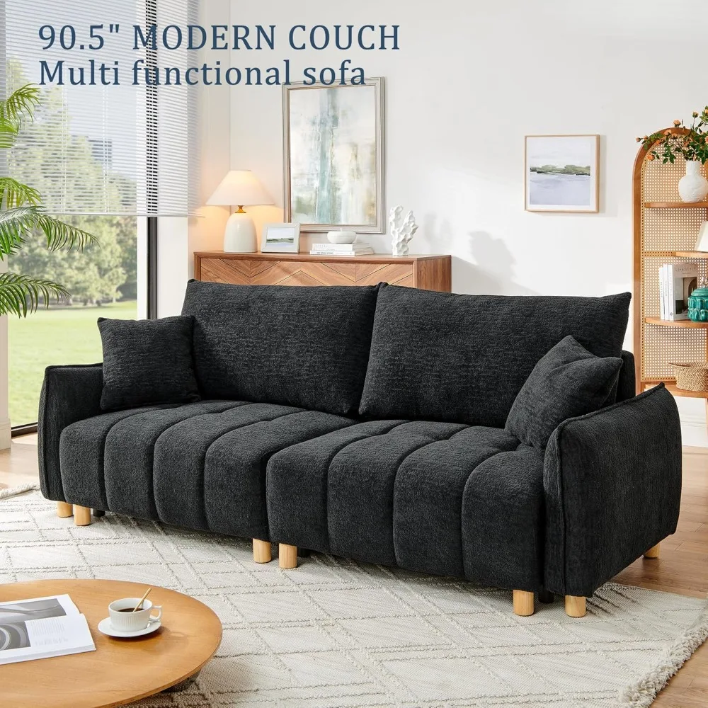 This item features a comfortable sofa bed designed with a cozy resting space, thanks to its two additional pillows and simple metal insert connection for easy assembly and stability. The sofa is crafted from high-density sponge and pocket springs for enhanced support. It's a versatile piece for apartments, as it can be easily transformed into a bedroom or guest space in just two steps, with a reinforced frame for lasting durability. The chenille sofa also includes a spacious hidden storage seat, perfect for keeping blankets, pillows, and other essentials organized while maintaining a comfortable seating area. Made with durable and breathable chenille fabric, this couch sleeper resists pilling and provides a soft, natural feel for long-term comfort. Assembly is straightforward and requires two people, taking approximately half an hour to complete. The product comes in three separate packages that may arrive within a few days. For any inquiries, feel free to contact us on Amazon.