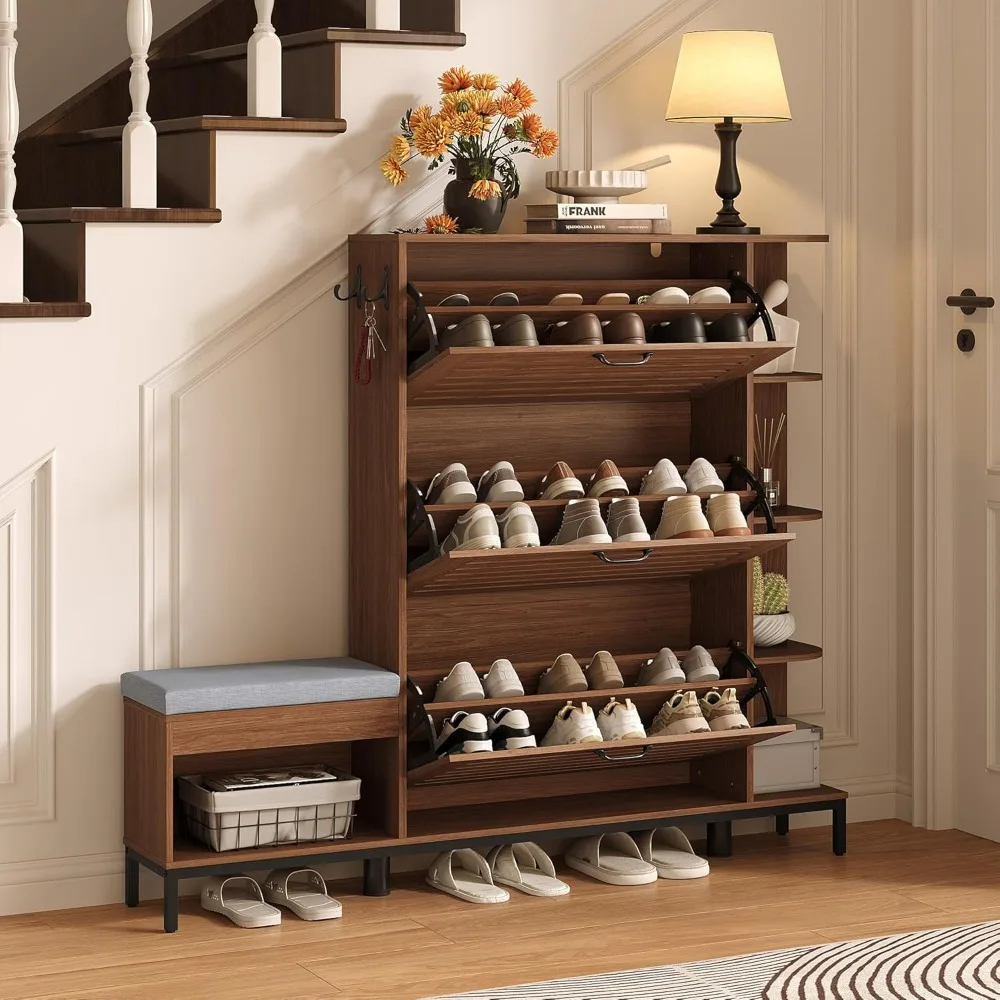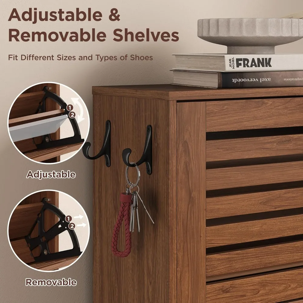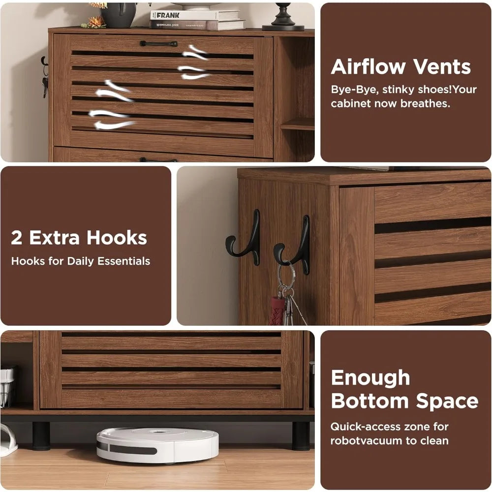 This shoe cabinet combines modern and farmhouse design elements, featuring a ventilated walnut (white) wood construction with unique grille-striped drawers that enhance both the aesthetic appeal and airflow within the cabinet. It seamlessly blends rustic charm with contemporary elegance, making it a perfect addition to any decor style. The shoe cabinet is equipped with three flip drawers, each with ergonomic handles, capable of holding up to 20 pairs of shoes of various sizes, from flip-flops to boots. The design of the flip drawers helps to minimize clutter and save space, making it suitable for narrow aisles or entryways. It complements any furniture in entryways, living rooms, hallways, and small apartments. The top and side open storage rack of the shoe organizer serve as a display shelf for items such as toys, decor, and small plants. The side panels also offer a convenient spot for hanging keys. The open lower shelf is ideal for storing shoes and a robot vacuum cleaner, making it an excellent choice for a mudroom cabinet to keep entries clutter-free. Constructed from premium quality particle board with a scratch-resistant finish, the shoe cabinet is durable, safe, and built to last. It includes an anti-tip wall anchor and a reinforced base for stability. The legs are crafted from solid metal, with two thicker metal legs in the middle for enhanced stability, making it safe for homes with children or pets and suitable for daily use. Assembly is straightforward, with step-by-step instructions and pre-labelled parts included, making it easy for anyone, even those without prior installation experience, to set up the shoe cabinet.