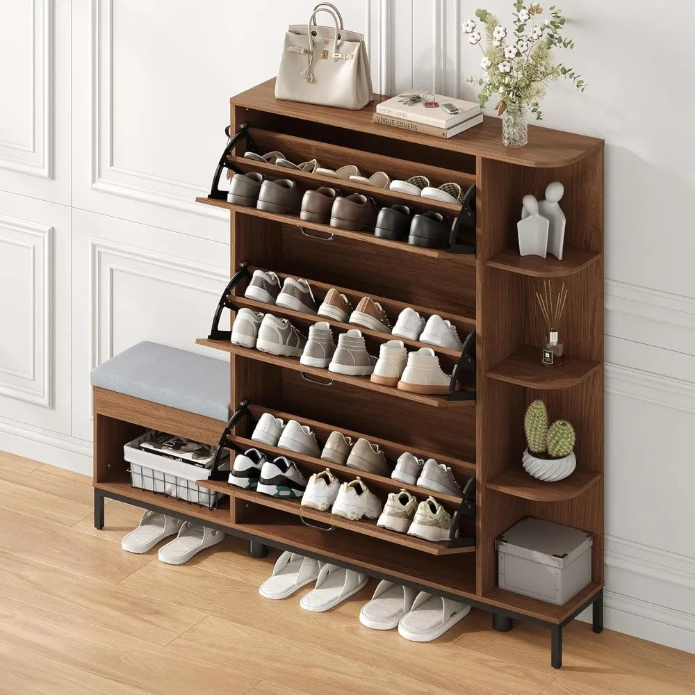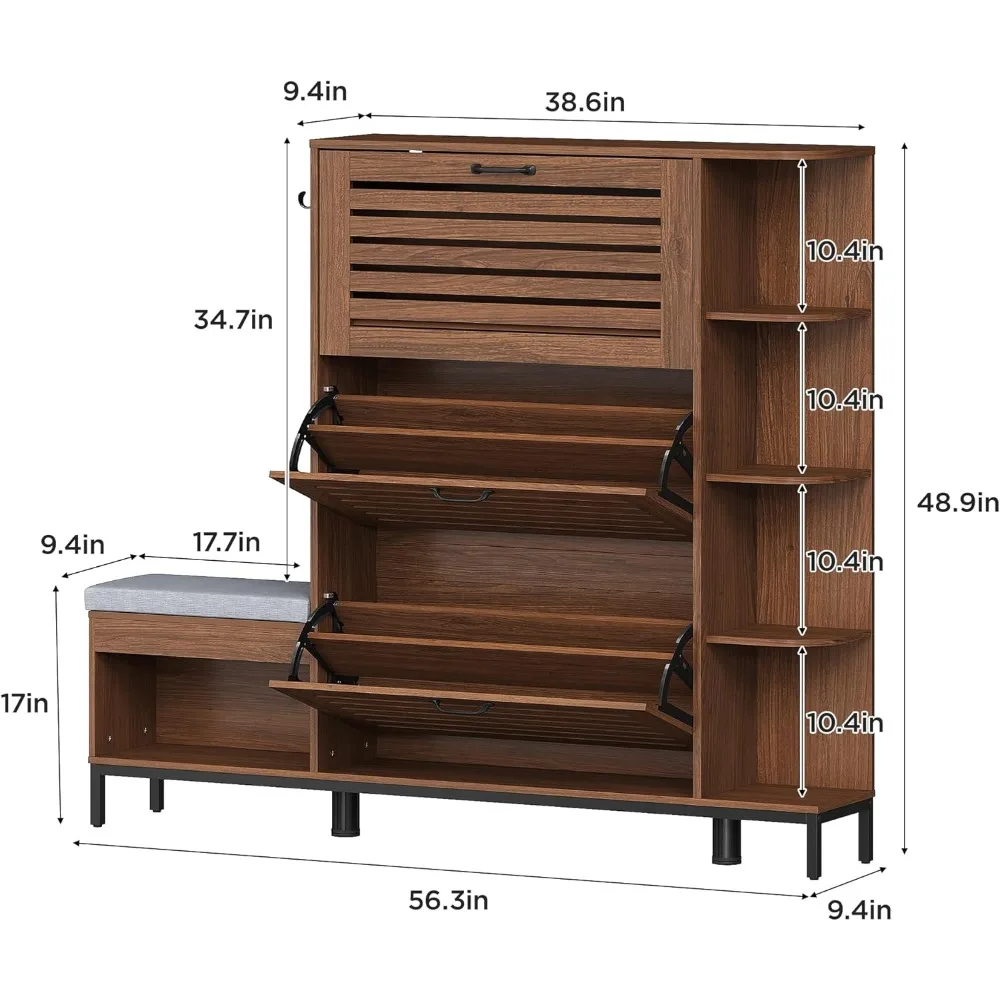 Compact Shoe Storage Cabinet with Bench and Flip Doors for Entryway, 44 Tall Organizer with Upholstered Seat