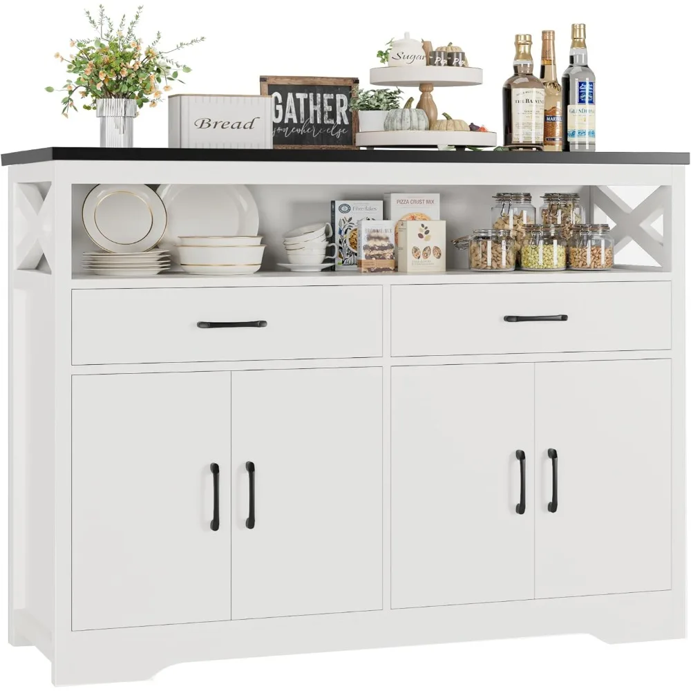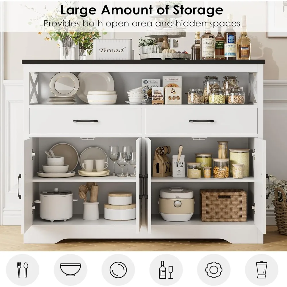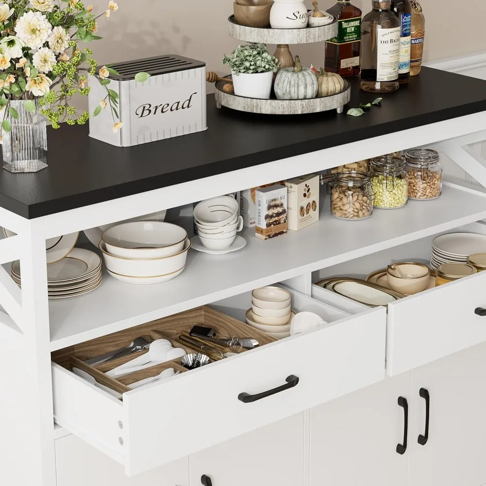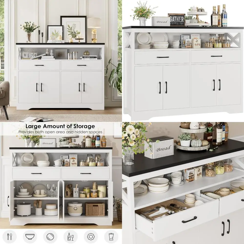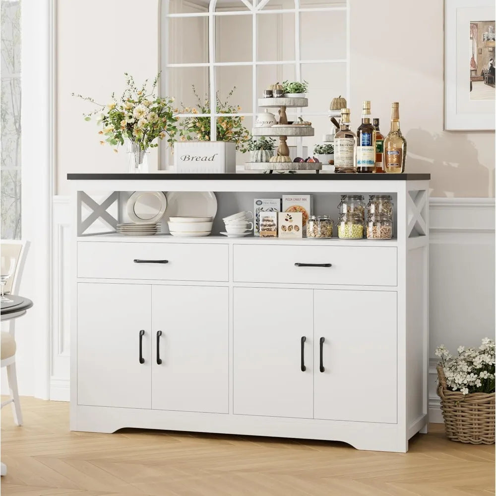 Contemporary Farmhouse-Style Sideboard Buffet, Wooden Storage Cabinet with Drawers and Shelves, Spacious Coffee Bar Cabinet