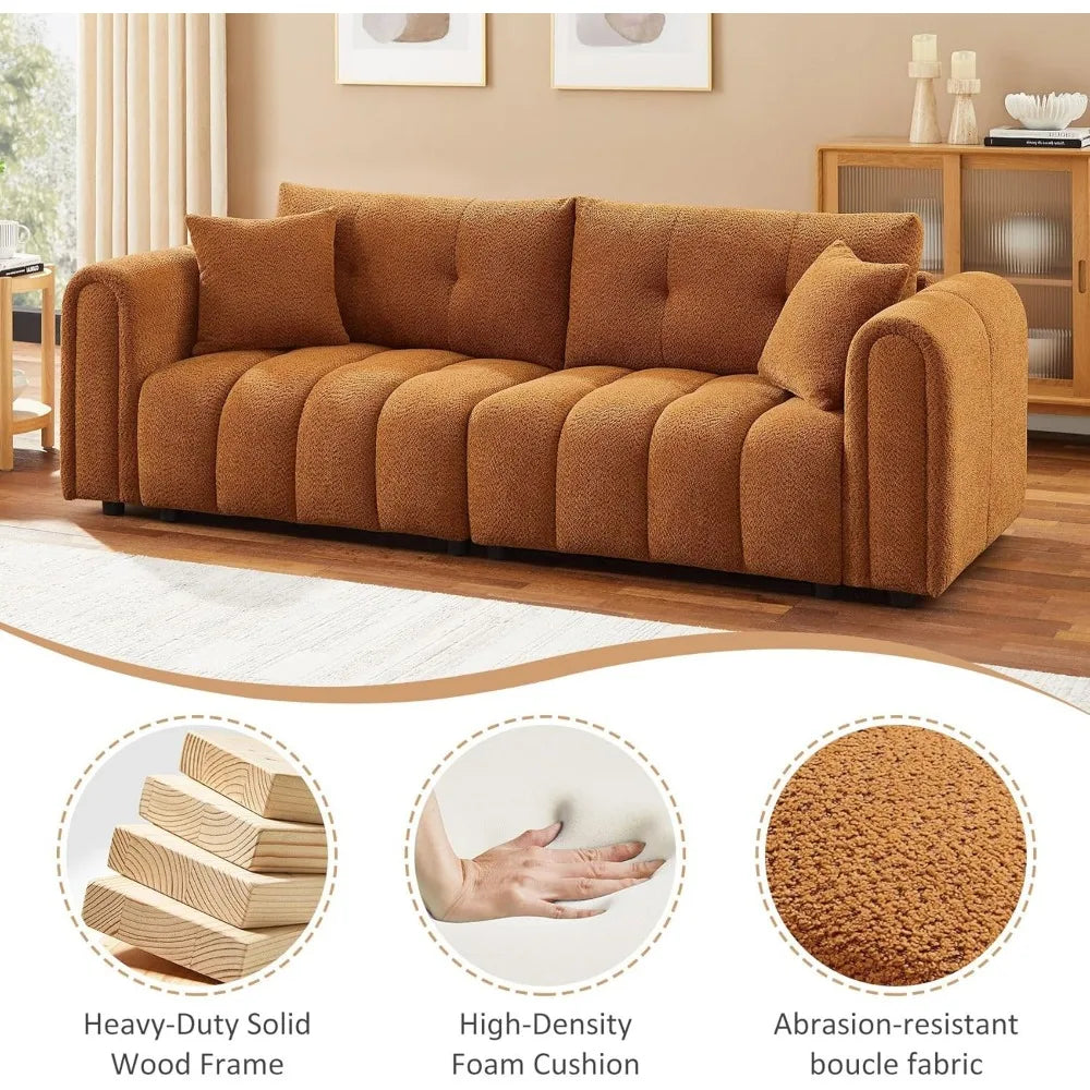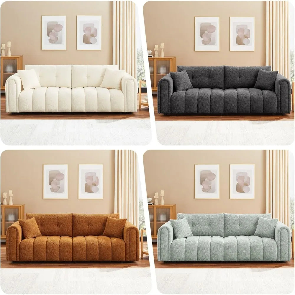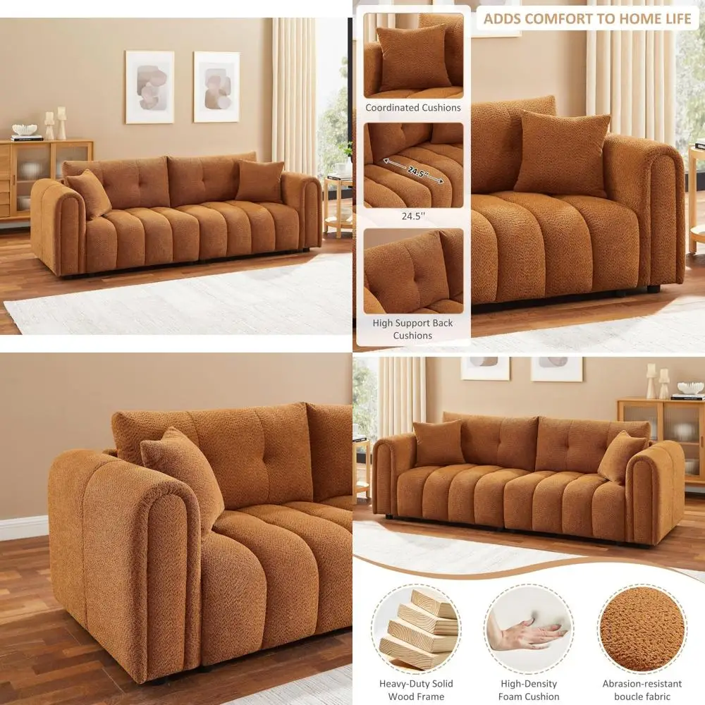 Here's a rewritten product description based on the provided information: This contemporary 3-seater sofa boasts a modern minimalist design and ample seating space, with a deep 24.5-inch seat. It's perfect for living rooms, apartments, offices, or lounges, adding a stylish touch to any space. Upholstered in high-quality boucle fabric, this mid-century modern couch offers durability, softness, and comfort. The fabric is breathable and warm, providing an ultimate comfort experience. The high-resilience sponge filling ensures the sofa maintains its shape and provides lasting comfort and support. Built with a sturdy solid wood frame, this lounge sofa can support up to 900 pounds, ensuring stability and durability for seating three people. It's ideal for family gatherings or social events, allowing you to relax and enjoy every moment with confidence. Designed according to ergonomic principles, this modern sofa conforms perfectly to your body contours, offering necessary support for your spine, shoulders, and back. It effectively relieves pressure, allowing you to fully rest and relax after a busy day. Please note that this living room cloud sofa couch will be delivered in three separate packages, which may arrive at different times and require assembly. If you have any questions regarding tracking numbers or delivery status, we're here to help. If you're not satisfied with the product, feel free to reach out to us.