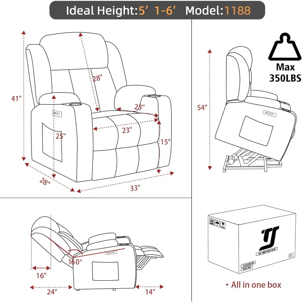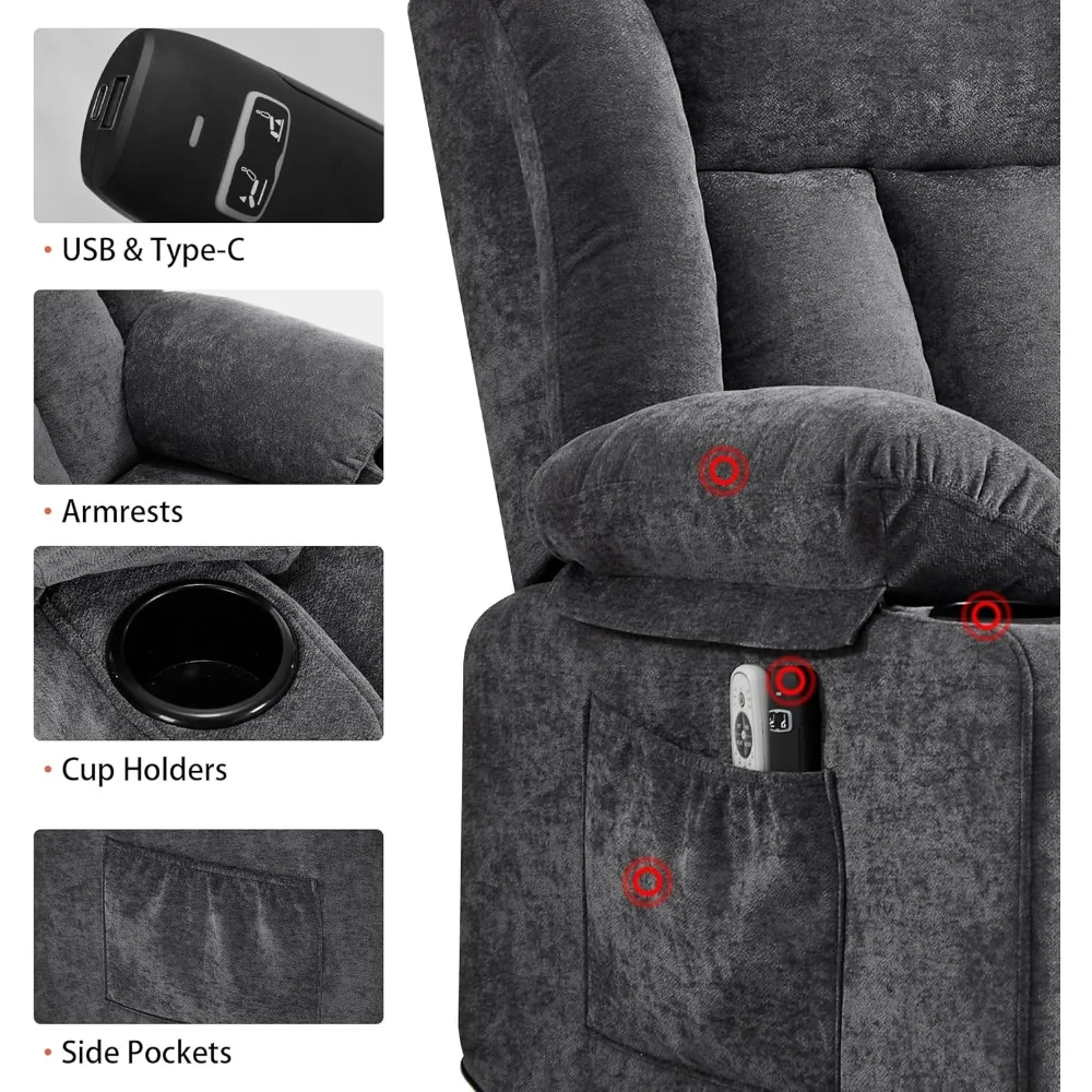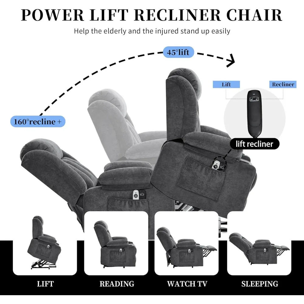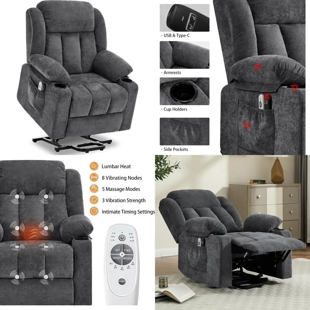 This product is a power lift chair designed for comfort and ease of use. It features an electric lift function that assists the elderly in standing up by reducing the strain on their backs and knees. The chair can recline to 160 degrees for optimal relaxation and includes side pockets, cup holders, and USB and Type-C charging ports for added convenience. The chair offers a customized massage experience with eight massage points, adjustable intensity, and various mode settings. It targets sore muscles and provides lumbar heat therapy for additional comfort, with independent control for personalized settings. Made with upgraded velvet linen fabric, the chair is durable, breathable, and soft, ensuring a comfortable seating experience that is also easy to clean. High-density sponge filling prevents the chair from collapsing even with long-term use, maintaining its comfort over time. The chair's design is supportive, with a thickened steel base structure capable of withstanding up to 350 pounds. It features an overstuffed design that provides excellent head and back support, making it suitable for various settings such as living rooms and bedrooms. The chair combines classic contemporary style with practical functionality. Assembly is straightforward, with the chair arriving in a single box and requiring no tools for assembly, which can be completed in about 15 minutes. A one-year warranty is provided, and support is available for any assembly issues that may arise.