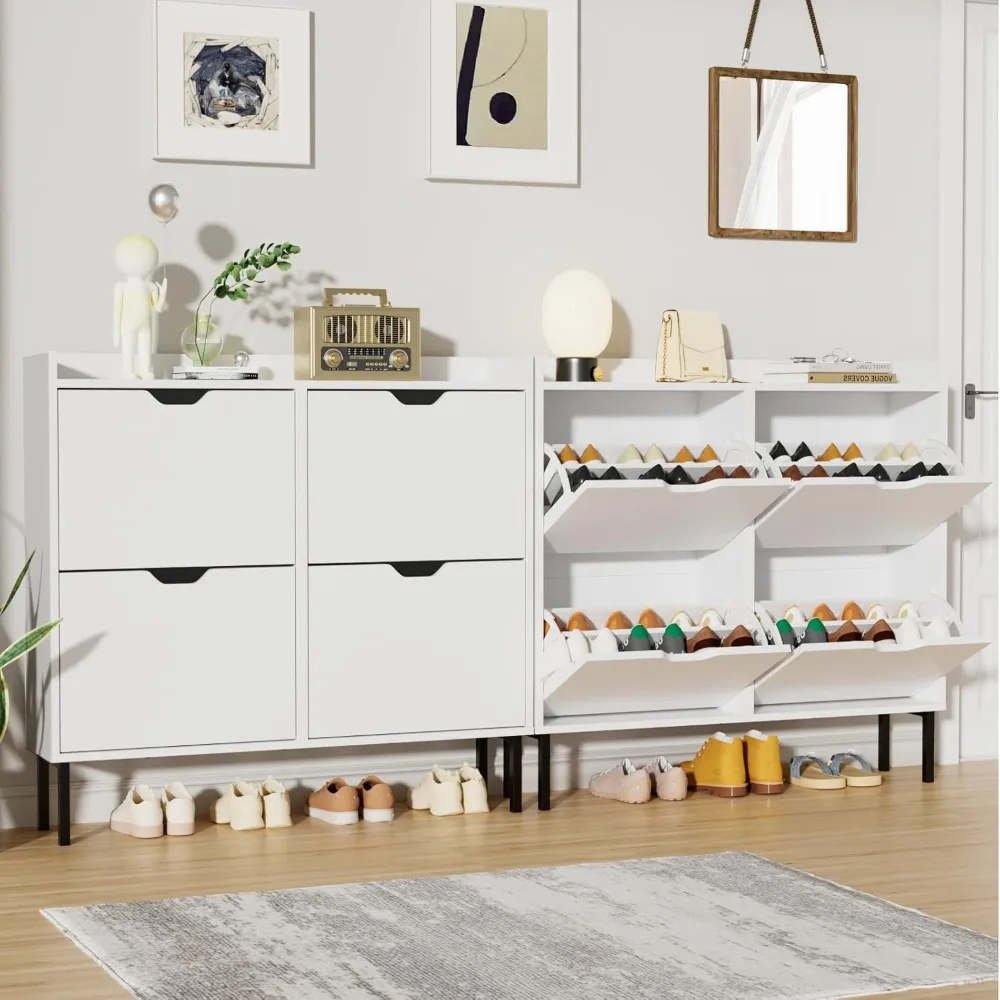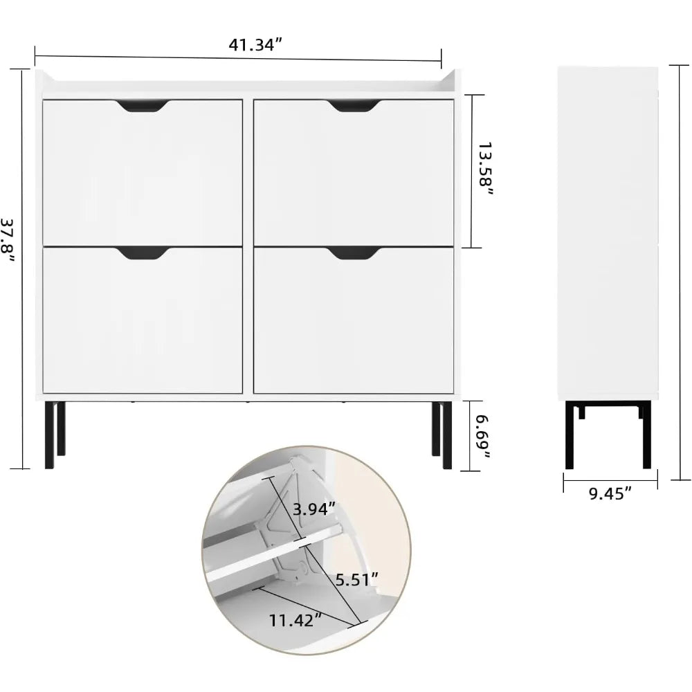 This shoe cabinet is designed for efficient storage, featuring 4 flip drawers with dual-layered compartments for ample space to organize shoes and home decor items. The adjustable shelves can be placed in two different grooves or removed, accommodating various shoe types and sizes, from flat shoes to high heels. The cabinet's flip drawer design is space-efficient and easy to operate, offering a practical solution compared to traditional shoe racks. It's perfect for narrow spaces, keeping shoes dust-free and away from pets, while maintaining a tidy entrance area. Versatile and stylish, this freestanding shoe cabinet can be placed in various locations such as the entryway, hallway, living room, or porch. Its design ensures a sophisticated and organized storage solution that enhances the aesthetic of any space. The shoe cabinet boasts a stable structure with an anti-tipping device that can be attached to the wall for added safety, especially for households with children. Constructed from high-quality MDF wood, it offers superior load-bearing capacity. Assembly is straightforward, with dimensions of 40.1 inches wide, 9.4 inches deep, and 37.8 inches high. All necessary accessories and clear instructions are included. Should you have any assembly queries, our customer service is ready to assist you with solutions.
