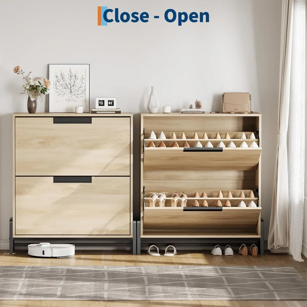 This shoe cabinet is a modern, space-saving design that features flip drawers, making it easy to access your shoes while keeping them dust-free and protected from pets and insects. It's a slim fit for narrow spaces, perfect for entryways, hallways, living rooms, or porches. The cabinet has a stylish and simple look that complements various home decor styles and helps maintain a tidy appearance in your home. The shoe cabinet has a large capacity, measuring 9.5 inches deep by 31.5 inches wide by 36.9 inches high, and can hold approximately 14 to 18 pairs of shoes. Each drawer has a two-tier storage system, and the removable shelves are adjustable to accommodate shoes of different sizes and styles. The cabinet also features a spacious top surface that can be used to store items like wallets, keys, or small plants, providing easy access to your belongings. For even greater storage, the cabinet can store up to 28 to 36 pairs of shoes with its two upper and lower drawers, each with a double-layer storage space. The panels can be adjusted or removed to fit various shoe heights and sizes, including flats, mid-heels, or boots. The bottom is suitable for placing slippers or a sweeping robot, and the top has a fence that's perfect for potted plants, ornaments, socks, and keys, ensuring they won't fall off. Assembly is user-friendly, with clear, step-by-step instructions and numbered parts provided. If you encounter any issues during assembly or have questions about the product, our customer service team is always ready to assist you.