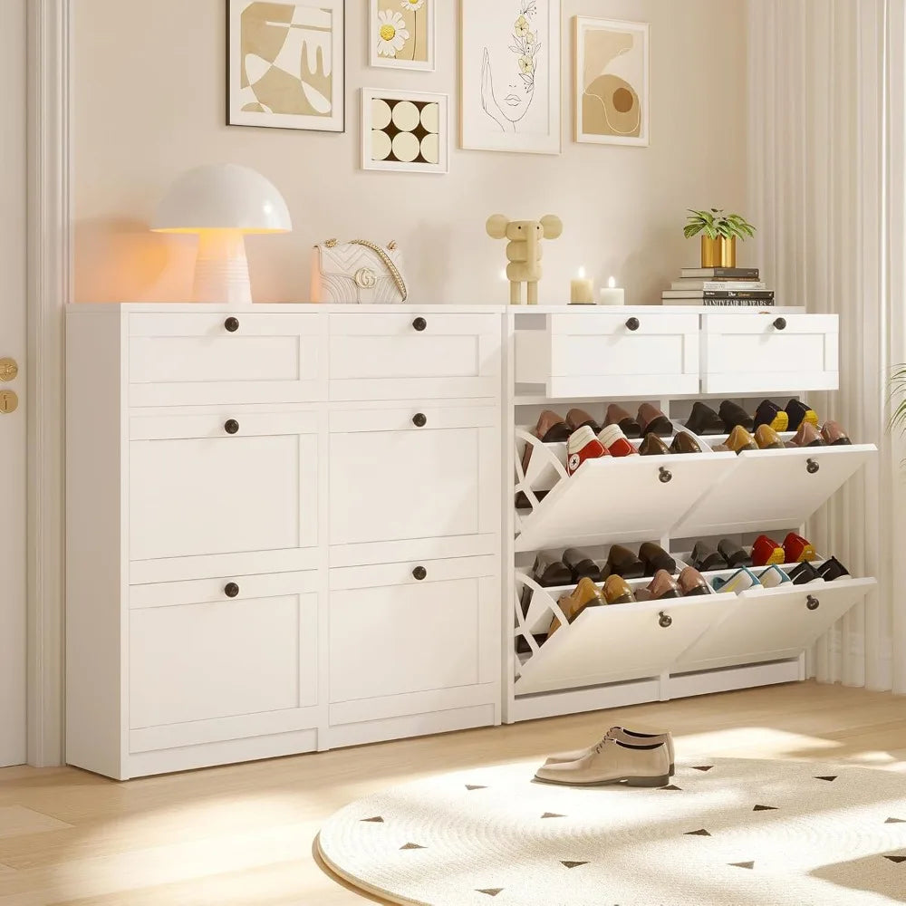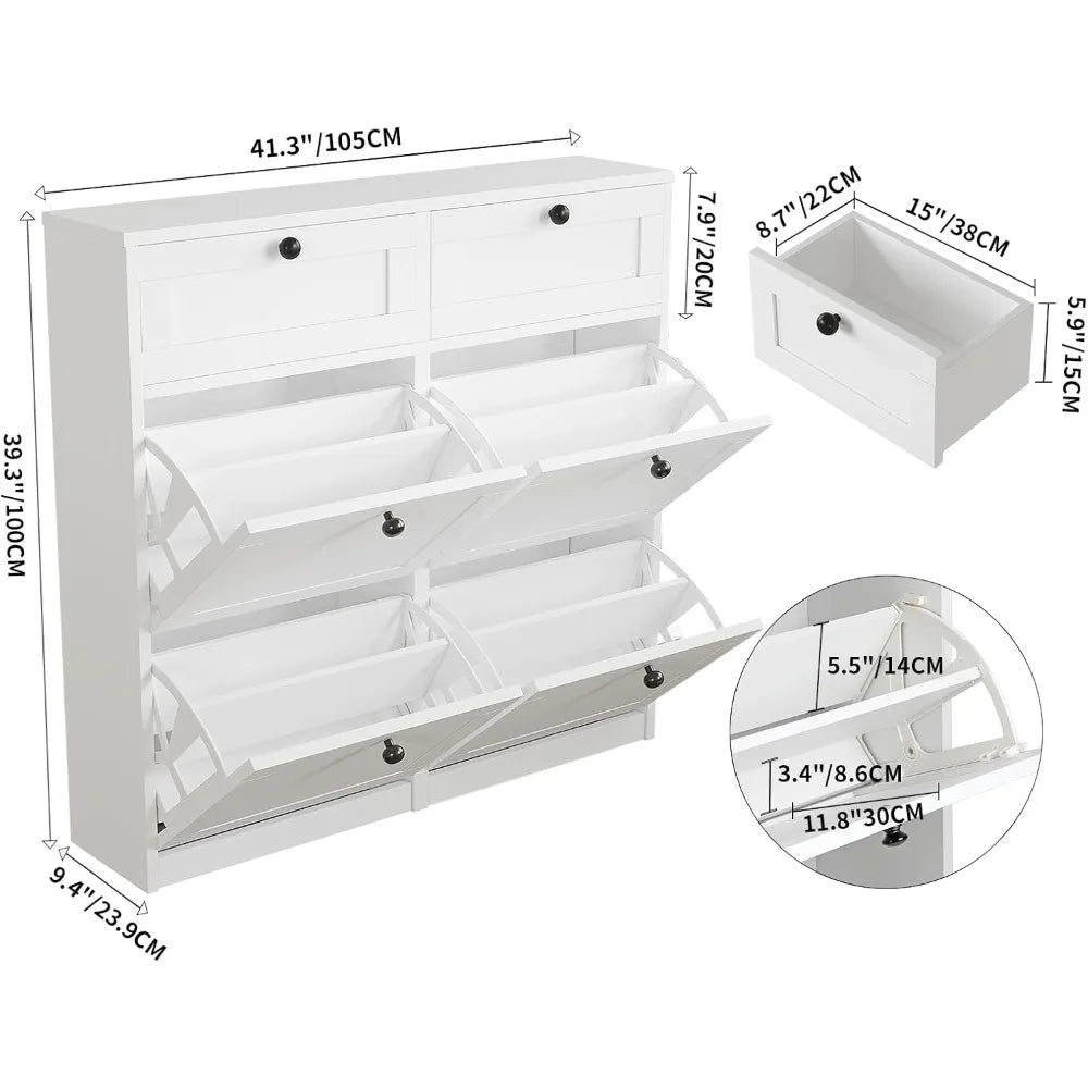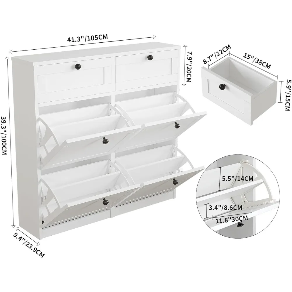 This shoe cabinet features a large capacity with four adjustable or removable flip drawers for versatile shoe storage. It also includes two additional drawers for convenient storage of small items like keys and wallets near the entrance. The cabinet is designed to save space with a slim profile, measuring 41.3 inches wide, 9.4 inches deep, and 39.3 inches tall. Its vertical design helps to keep your entryway organized and stylish, fitting well with various home decor styles. Made from high-quality MDF and durable metal accessories, the shoe cabinet offers a sturdy construction for reliable support. The black handles are both elegant and comfortable, making it easy to access the contents of each drawer. For added safety, the cabinet comes with an anti-tip device that can be attached to the wall, preventing accidents from children or pets knocking it over. The cabinet is designed with a practical pull-down drawer system that is simple to operate. Assembly is straightforward, with all necessary parts and clear instructions provided. Should you encounter any issues during assembly, customer support is available to assist you.
