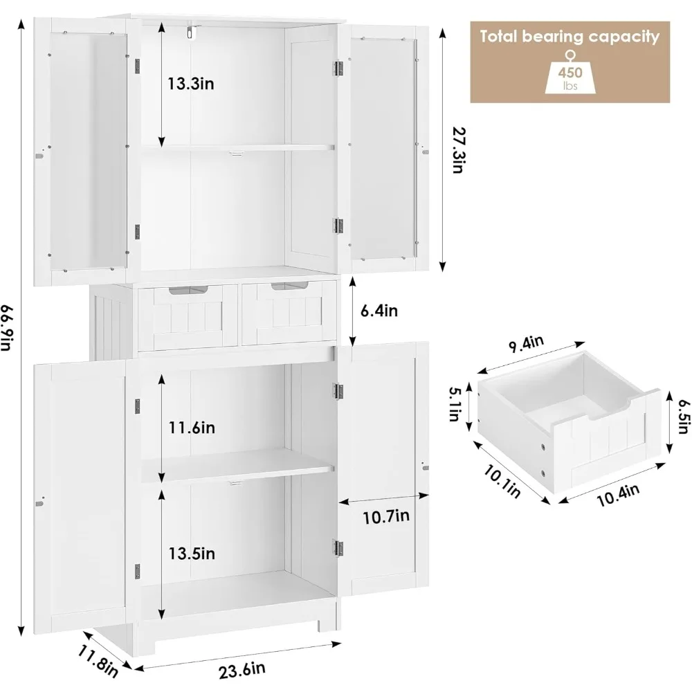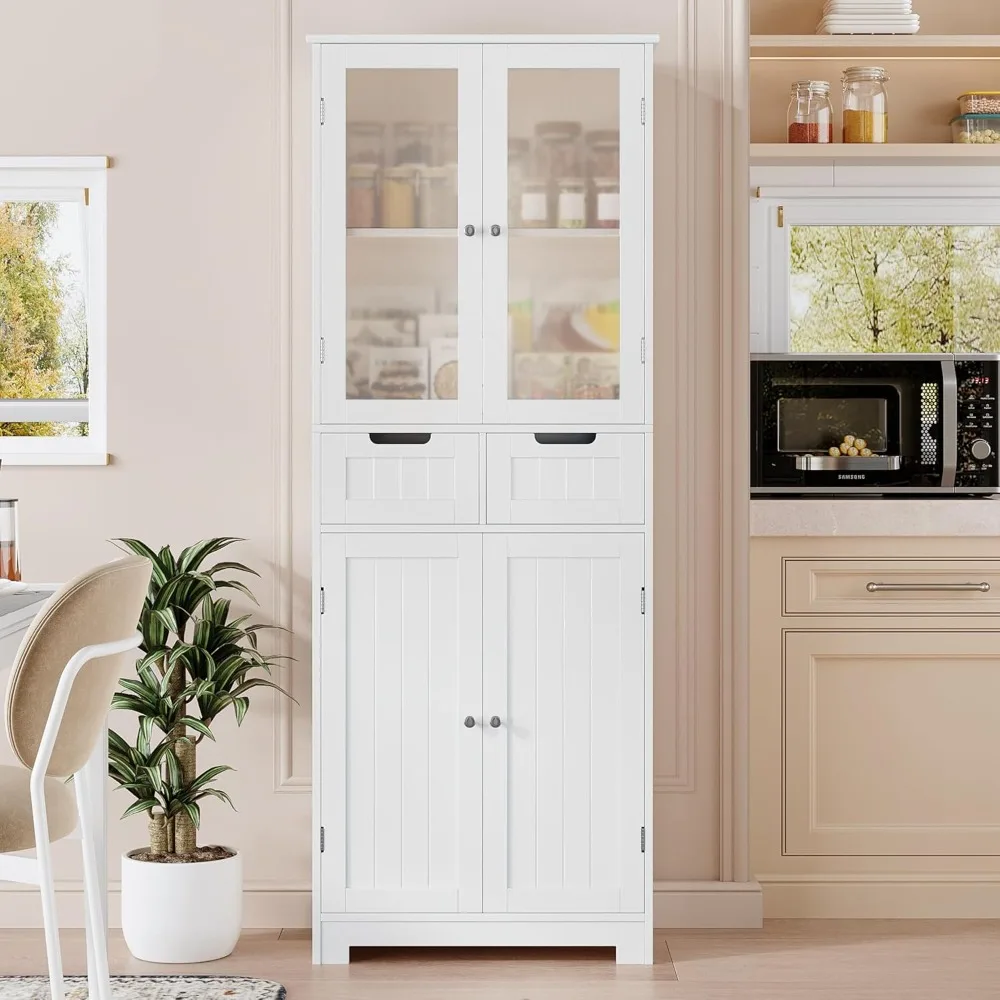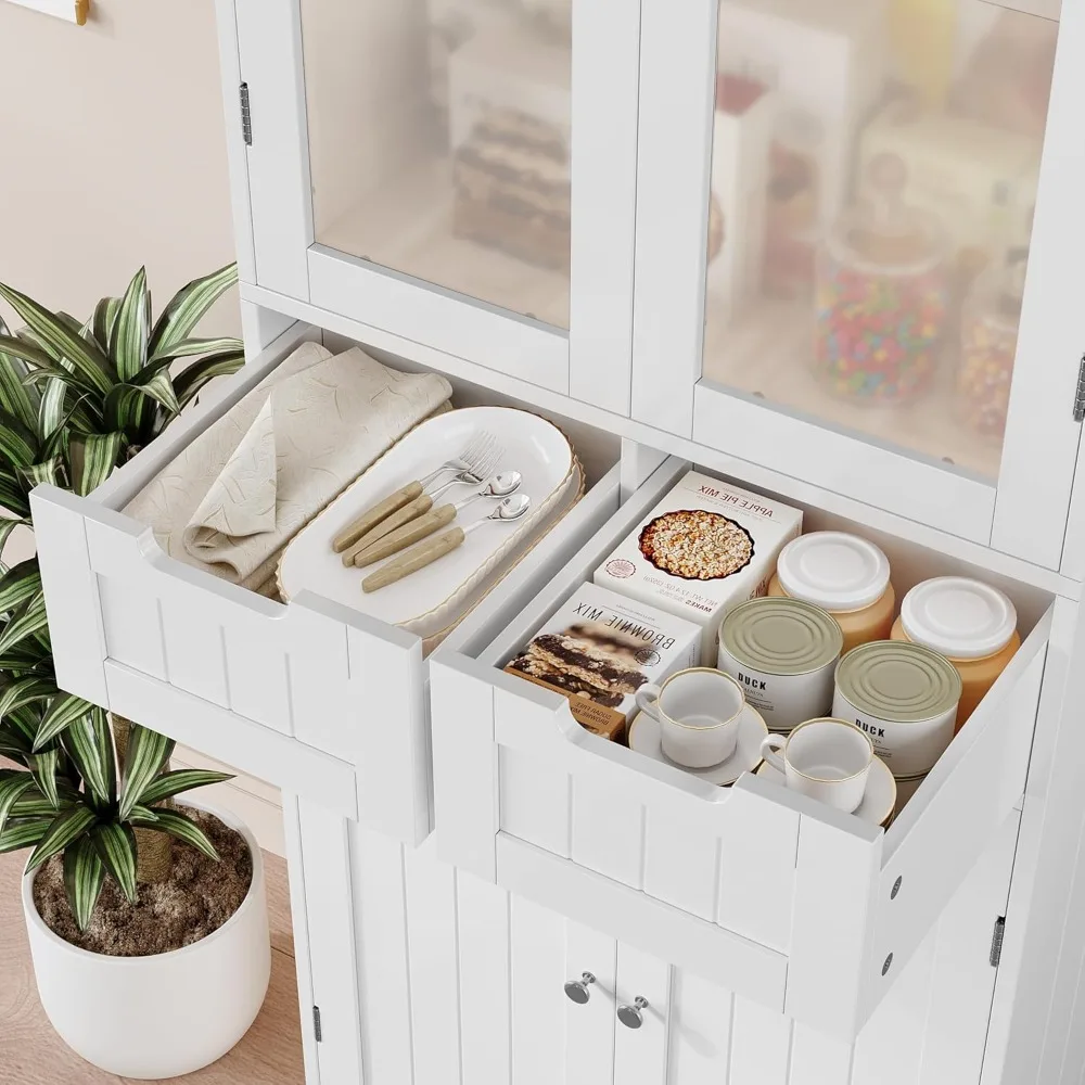 Freestanding Tall Storage Cabinet with Drawers and Glass Doors for Kitchen and Bathroom