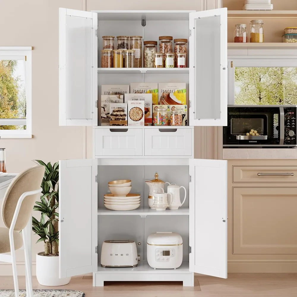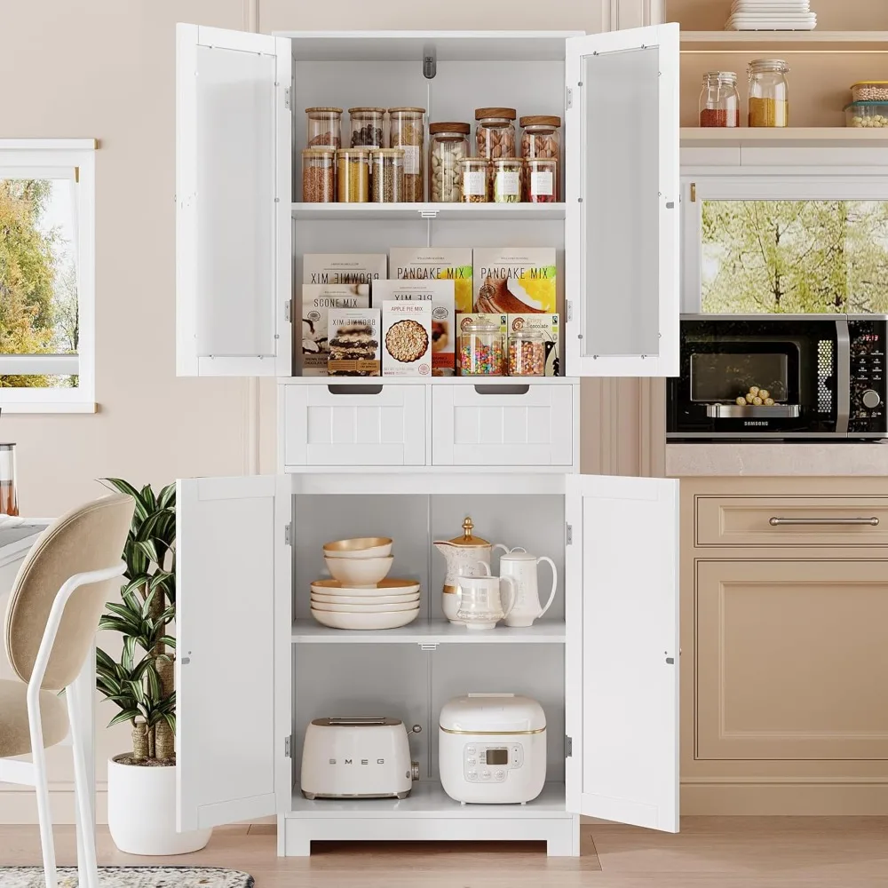 This item offers ample storage space with upper and lower cabinets featuring two-tier shelves, perfect for organizing various kitchen items, coffee essentials, toiletries, and small gadgets. The cabinet's design helps keep your home tidy with its excellent storage capabilities. Versatile in use, it can serve as a pantry in the kitchen, a storage unit in the living room or home office for books and files, or even as a bathroom cabinet for toiletries. The modern minimalist design with a classic white finish, frosted glass doors, and a clean profile complements any home style, showcasing your taste. The dimensions are 11.8 inches deep by 23.6 inches wide by 66.9 inches high. Built to last, it features a waterproof painted body and a reinforced structure made from high-quality engineered wood, ensuring stability, durability, and easy maintenance with a weight capacity of 280 lbs. Assembly is straightforward, with clear instructions and labeled parts, allowing you to complete the process within approximately 2 hours.