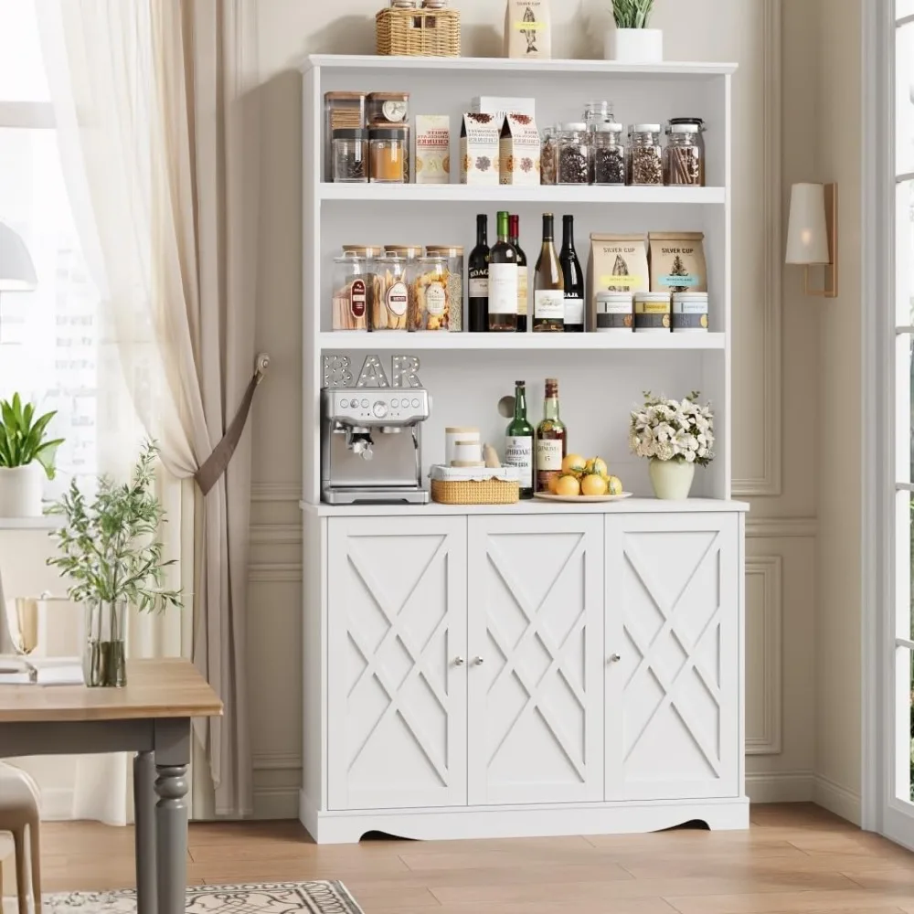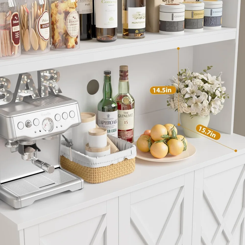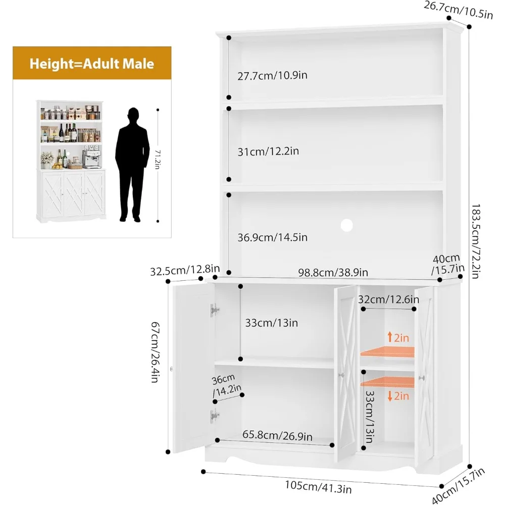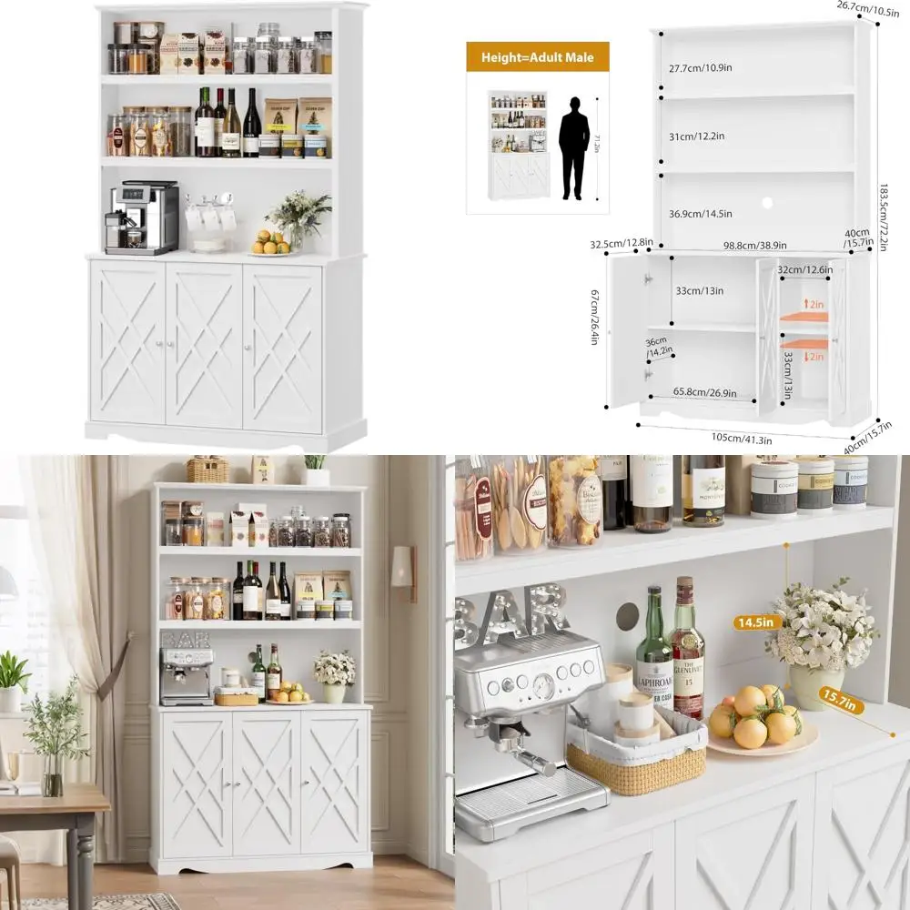 This spacious kitchen cabinet is designed to transform your kitchen into an organized haven. It features a cable-managed countertop, three open shelves, and a two-door storage cabinet, along with an adjustable single-door cabinet for customized storage. Ideal for storing canned goods and appliances, this cabinet ensures easy access and a clutter-free kitchen environment. The cabinet embodies modern farmhouse style with its barn door design, sleek metal handles, and classic color options. It adds a warm, inviting touch to your kitchen, blending seamlessly with contemporary farmhouse decor. Versatile in its use, this kitchen cabinet can be adapted to fit various spaces. It can serve as a microwave cabinet for food and cutlery, a buffet cabinet for coffee makers and toasters in the dining room, or a display cabinet for books and trophies in the living room. Made from premium manufactured wood, the kitchen cupboard showcases excellent craftsmanship and a sturdy structure. It promises long-lasting stability, making it a reliable addition to your home that withstands the test of time. The cabinet measures 15.7 inches in depth, 41.3 inches in width, and 72.2 inches in height. Assembly is made easy with this tall pantry cabinet, which comes with labeled parts and comprehensive assembly instructions. The numbered parts and tested assembly process ensure a frustration-free setup suitable for any skill level.