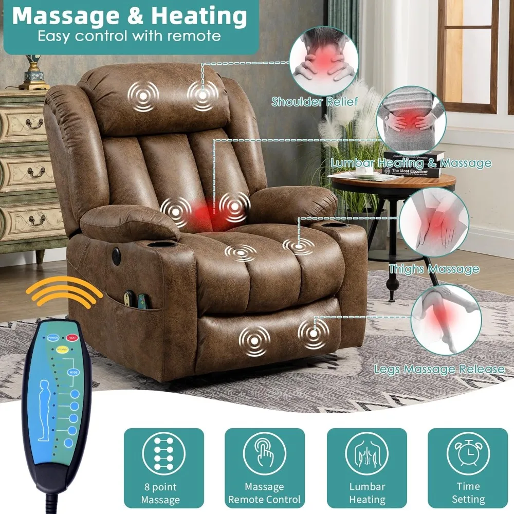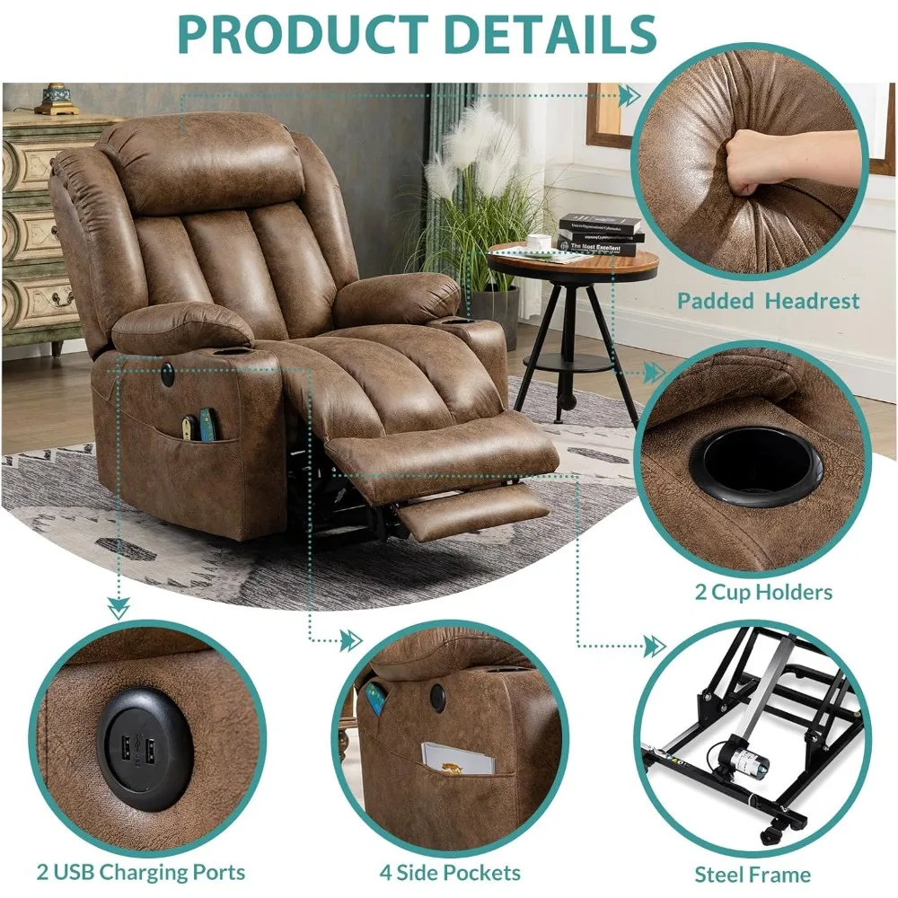 This product features an upgraded size and extra-wide seat, designed to accommodate individuals with larger physical characteristics. The lift seat has been widened to 24.8 inches and the backrest height increased to 29.5 inches, providing ample space for hips and legs and enhancing overall seat stability. The overstuffed lift sofa dimensions are W36.2" X D39.3" X H44.1", ensuring a premium comfort experience for larger individuals with a weight capacity of 350lbs. Equipped with a user-friendly remote control, this lift chair allows for easy adjustments in reclining, lifting, or tilting, addressing the issue of reaching the lift button while lying down. The powerful motor smoothly adjusts the chair to any position within a range of 45°-150°, making it an ideal solution for those with mobility issues or recovering from surgery. The footrest has been extended by an additional 5.1 inches, allowing users to stretch out fully while still having their feet well supported. The recommended height for optimal use is 5'7"-6'2". The recliner is crafted from high-quality bronzing suede fabric, which resembles leather in appearance, is soft to the touch, durable, and easy to clean without pilling. This recliner comes with a full-body massage feature and lumbar heating, controlled by a wired remote. It has 8 vibrating points around the chair and 1 lumbar heating point, offering 5 modes of vibration to cater to various relaxation needs. Both features can be set to turn off after 15, 30, or 60 minutes, with the heating function operating independently of the vibration. The design of this tall man recliner includes extra padding on the backrest for added comfort during reading, watching TV, or sleeping, supporting the neck, back, and lumbar. It also features dual USB outlets for charging devices and four side pockets for small items, along with two cup holders on the armrests for added convenience. Note that the USB ports are suitable for low-power devices like iPhones and iPads. Assembly is straightforward and can be completed in 10-15 minutes without tools. The product comes in three boxes, which may be delivered on different days. The maximum reclining angle is 150°, and a one-year warranty is provided, covering quality issues, shipping damage, and missing parts during transportation.