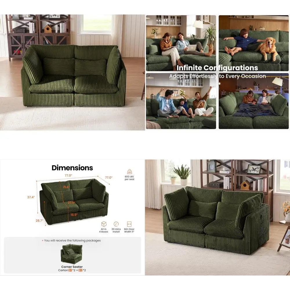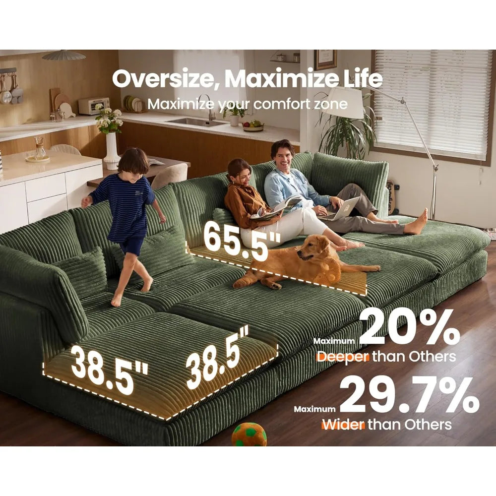 This item features an oversized and extra-wide seating area, providing a deep and comfortable experience. With a seat depth of 27 inches, it is 16.75 to 20% deeper than most sofas, and a width of 38.5 inches, making it 10 to 29.7% wider than typical couches. The sofa is designed with high-density foam, soft corduroy, and tightly woven chenille fabric, offering a perfect blend of softness and firm support. It's ideal for both relaxation and focus, transforming every moment into pure comfort. The sectional's modular design allows for endless configurations, making it easy to transform your space. Whether you need an L-shape for movie nights, a U-shape, or a spacious sleeper for entertaining, this sectional can be reconfigured to fit your needs. It's perfect for living rooms, home offices, or entertainment spaces, offering customizable comfort without the need for complicated tools. Enjoy seamless reconfiguration for various activities. Assembly is a breeze with this tool-free design. The modular design uses high-quality U-shaped stainless steel connectors for a secure fit between each module, allowing for quick and easy setup. You can enjoy your sectional in as little as 20 minutes, making it perfect for those who value convenience and flexibility. Durability is key with this sectional, built to last with a strong hardwood frame and high-density foam cushions. It's perfect for families, pet owners, and anyone who needs furniture that can handle daily wear and tear. This modular sectional retains its shape even with constant use, providing peace of mind and long-lasting comfort. The sleek, modern design of this sectional complements any decor with its minimalist and elegant appearance. It suits both contemporary and traditional interiors, adding a touch of sophistication to your living space. The neutral tones and durable, pet-friendly fabric make it easy to maintain, enhancing your space without compromise. For your convenience, the sectional is shipped in four packages, allowing for easier handling and assembly. Each package is carefully packed for safe transit, and our professional customer service is ready to assist you with any concerns. The thoughtful design ensures a simpler and more efficient setup process, so you can enjoy your sectional without any hassle.