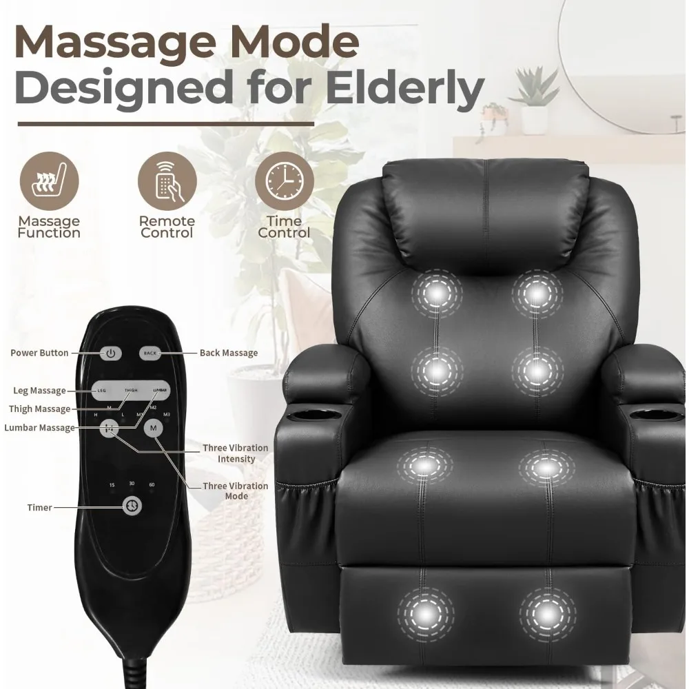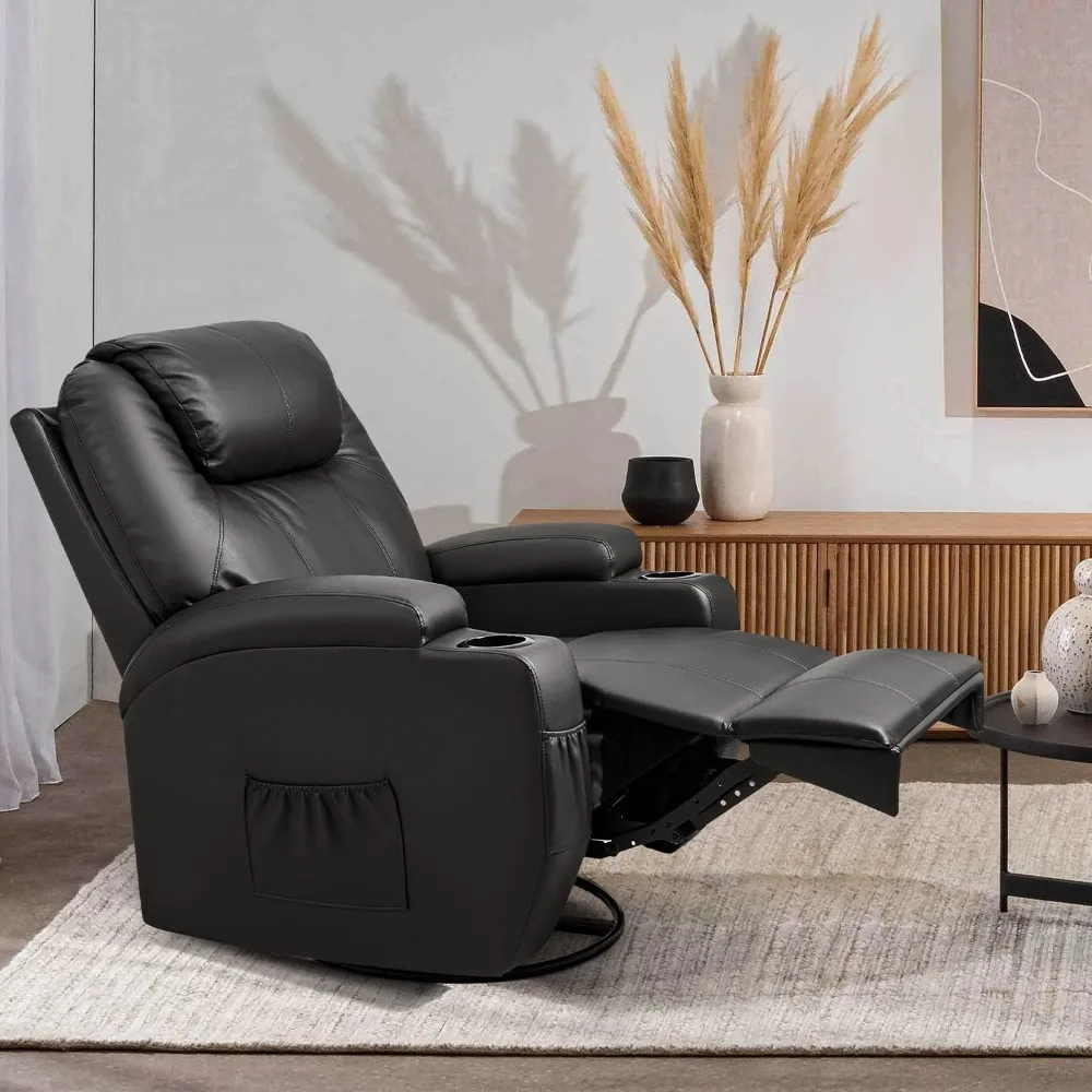 This product features a reclining sofa that comes in two separate parcels, which may arrive at different times. For any inquiries after receiving the package, you can reach out to our dedicated customer service and technical support team. The remote controls are conveniently placed in a small box under the chair bottom. The sofa is designed for ultimate comfort, with a sturdy faux leather surface that gives it a sleek and elegant appearance. It is filled with fluffy padding for a soft feel, ensuring you won't experience any hardness. The base of the sofa is made from sturdy metal, providing a swivel base that can support significant weight. In addition to its comfort, the sofa boasts a vibration massage function, offering an 8-point massage, three levels of vibration intensity, and three modes of adjustment. When the footrest is extended and the lumbar support is lowered, you can activate these features for a personalized relaxation experience. The sofa also offers practical functionality with a 140-degree lie-down feature to reduce back pressure, a 360-degree rotation for easy direction changes, and a 30-degree rocking motion for enhanced relaxation. For added convenience, the recliner includes four side pockets to hold items such as a remote control, cell phone, and books, as well as two cup holders to keep your drinks within reach and your hands free.