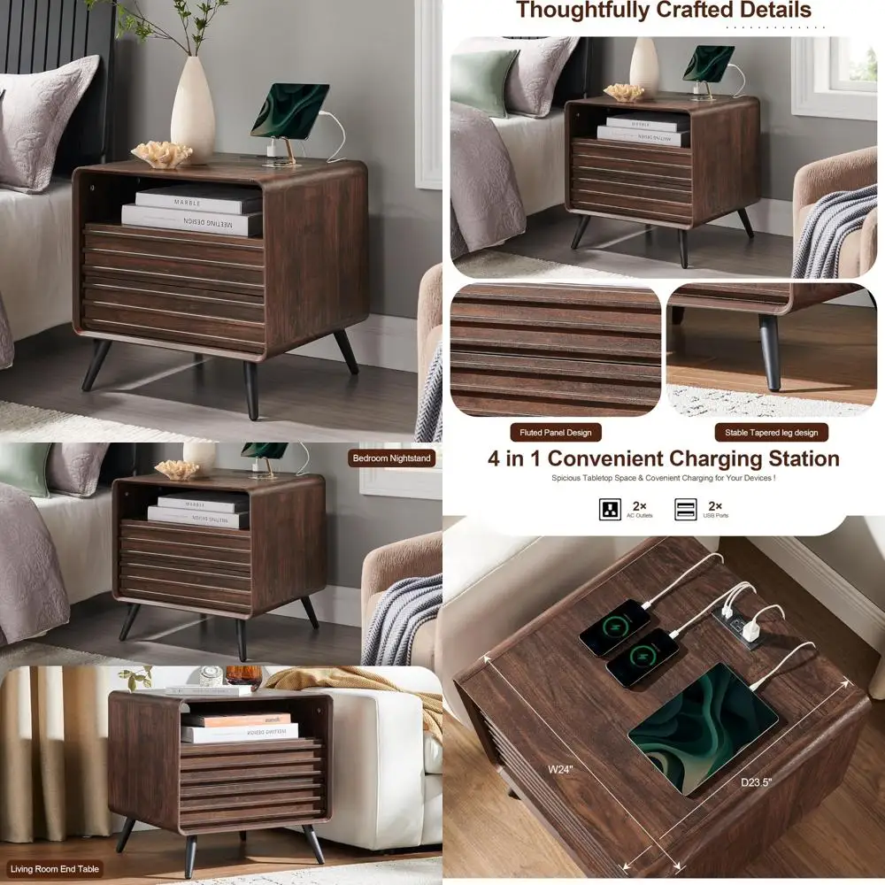 Here's a rewritten product description based on the provided information: --- This nightstand features a unique slatted panel design inspired by the flowing beauty of nature, capturing the gentle rhythm of natural elements. With rounded corners, it blends elegance with durability, adding a charming mid-century modern aesthetic and a luxurious ambiance to your room. It's also designed with safety in mind for little ones at home. The nightstand offers a spacious 24-inch desktop, perfect for placing mobile phones, laptops, desk lamps, and other daily essentials without clutter. The top panel includes 2 AC sockets and 2 USB ports, making it convenient to charge your devices without searching for outlets. For ample storage, this mid-century modern nightstand includes 2 smooth-glide drawers and a semi-open top cubby with a cord cutout. It's ideal for storing laptops, books, and daily necessities, and can be used in both bedrooms and living rooms. The large cable hole keeps power cords and charging cables neat and organized. Built with high-quality MDF and engineered wood, this nightstand ensures years of use and long-term stability. The thickened tabletop can hold up to 50 lbs, and the tapered leg design adds both elegance and stability. Assembly is easy with all screws and parts labeled, and clear, step-by-step illustrated instructions provided. The nightstand arrives in a secure box with foam and wood protective boards surrounding it. Should you have any questions or issues, feel free to reach out for assistance. ---