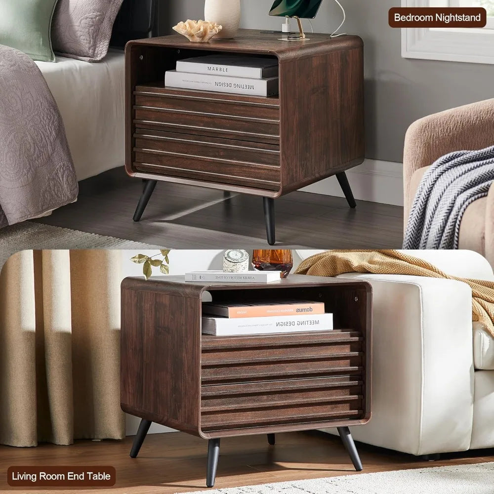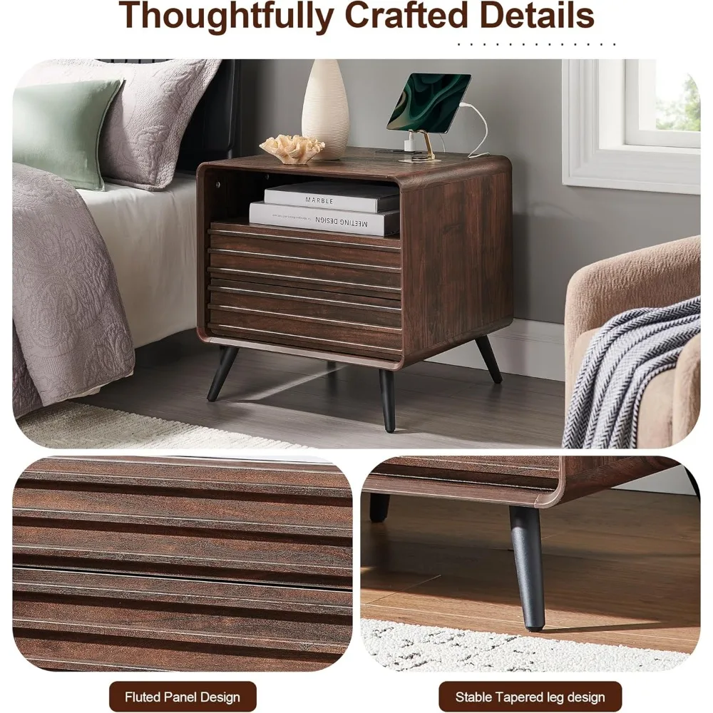 Mid Century Modern 2-Drawer Nightstand with Charging Station, Fluted Wooden End Table with Open Shelf
