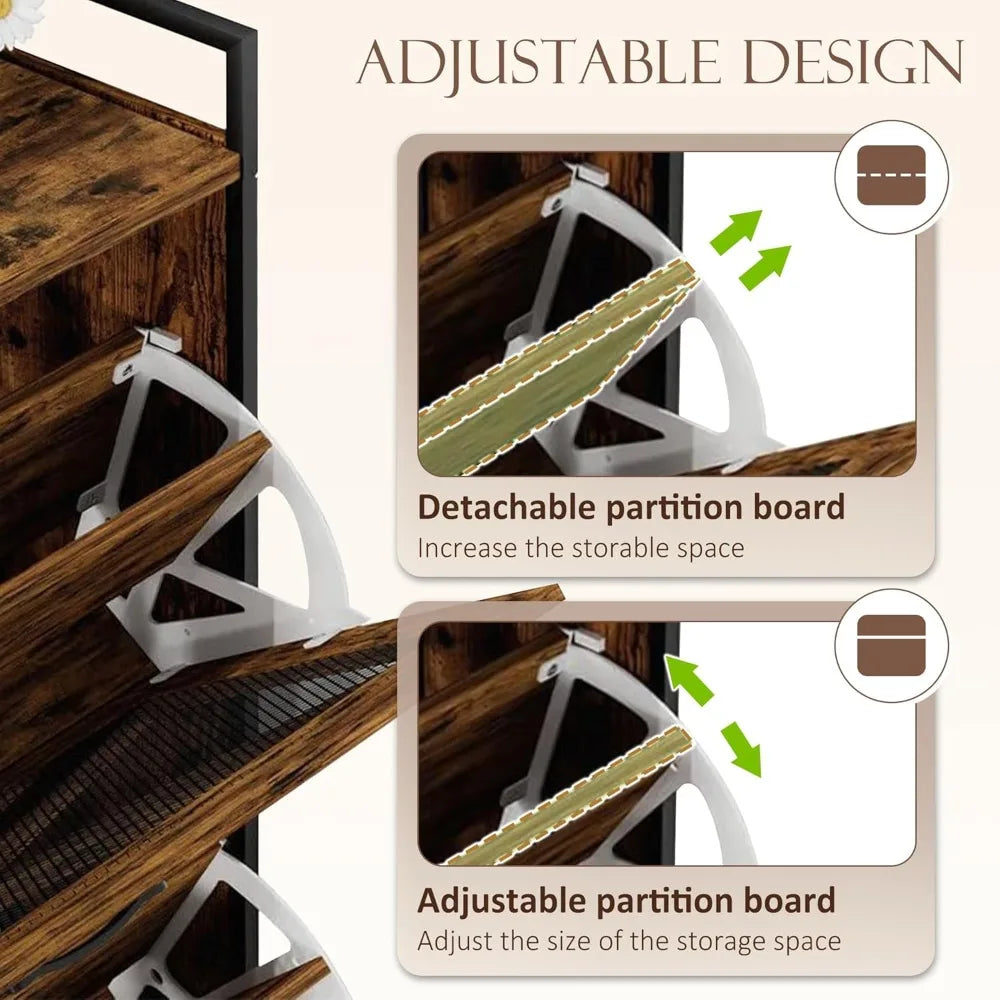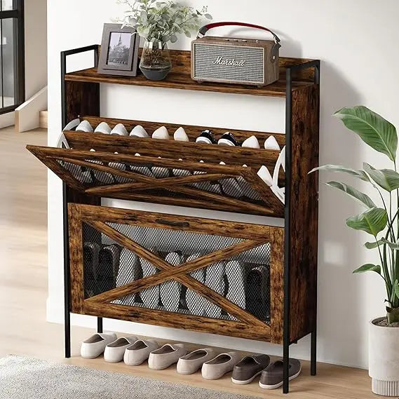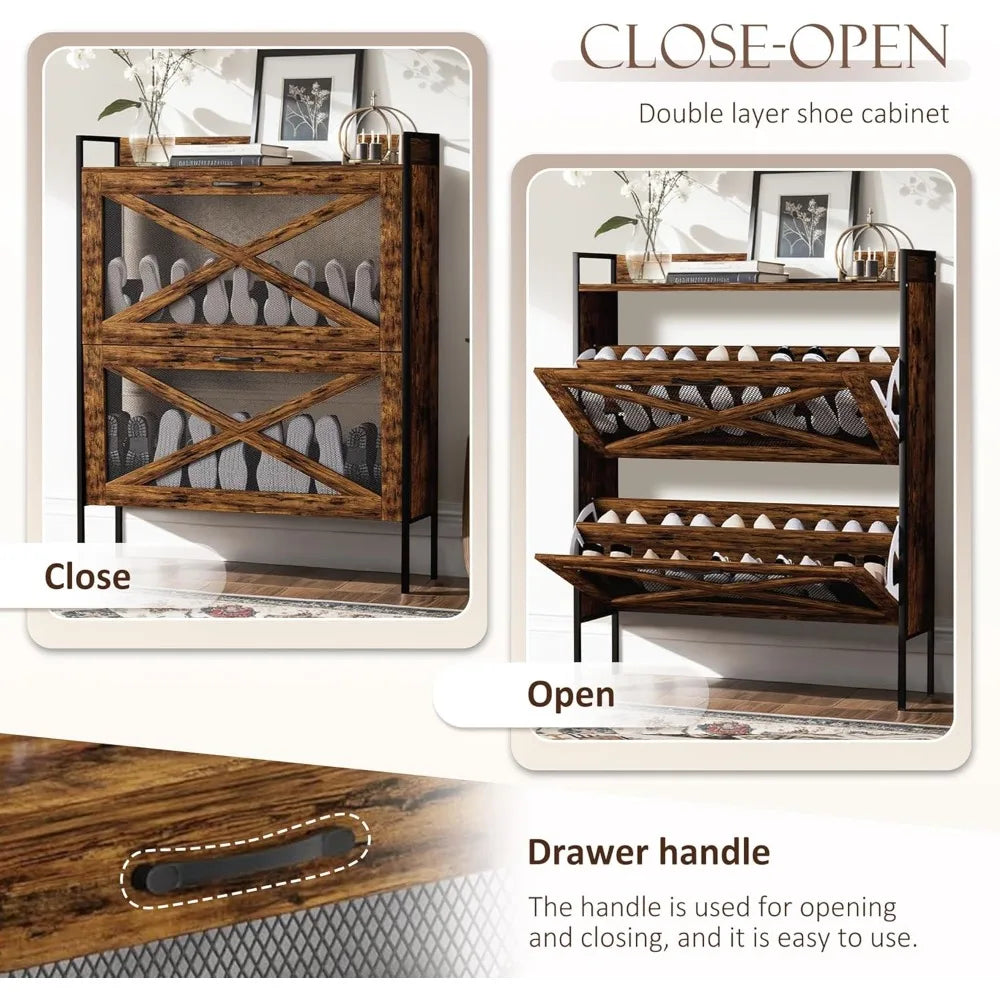 Rustic Brown Slim Shoe Cabinet with Two Drawers for Closet, Entryway, and Living Room - Narrow Storage Solution