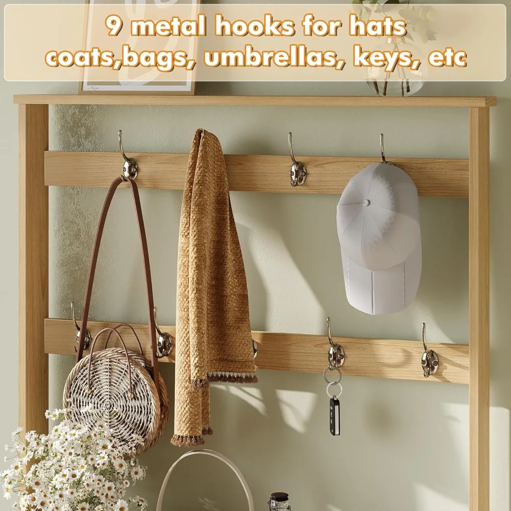 This multi-functional cabinet is designed for efficient shoe storage and more, measuring 63.8 inches in height, 30.7 inches in width, and 9.4 inches in depth. It features two flip-drawers, a top open shelf, and nine metal hooks ideal for hanging hats, bags, umbrellas, and keys, making it a perfect addition to entryways, hallways, living rooms, or porches. The cabinet is crafted from natural rattan material, with handwoven rattan-decorated doors that offer moisture and heat absorption properties, as well as an aesthetically pleasing visual effect. The elegant golden handles add a touch of charm to your home. The user-friendly design includes flip drawer doors that make it easy to locate and remove shoes quickly. Each drawer comes with an adjustable shelf, allowing you to customize the storage space to fit your specific needs. Safety is a priority with this cabinet, as it includes an anti-tipping strap on the back that can be secured to the wall to prevent accidental falls. Comprehensive assembly instructions are provided within the packaging, with all parts and accessories labeled for easy assembly. If you encounter any installation issues, our customer service team is ready to assist you.