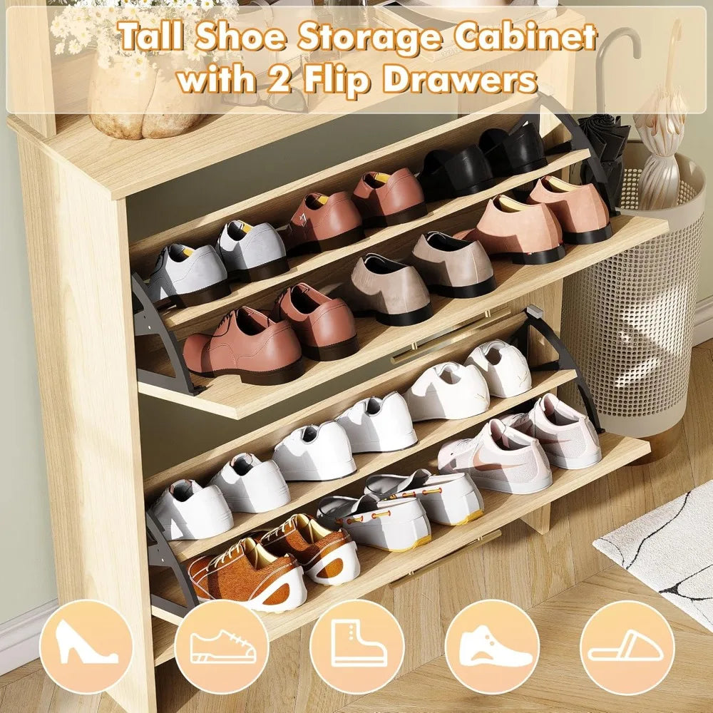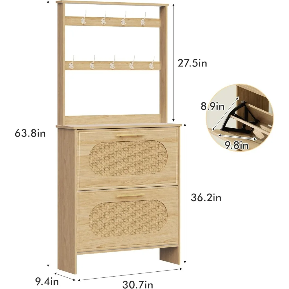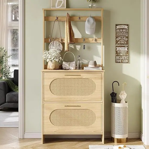 Tall Shoe Storage Cabinet with Rattan Door, Coat Rack, and Flip Drawers