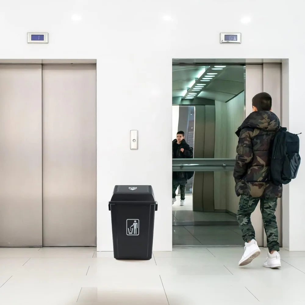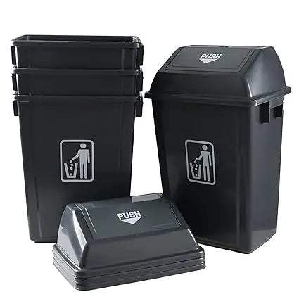 This product is a 13-gallon trash bin with dimensions of 15.24 inches by 10.63 inches by 24 inches. It is constructed from durable plastic, which is simple to clean using just a damp cloth. The large capacity makes it perfect for large families, busy homes, or commercial settings. The bin features a swinging lid that conceals the trash and comes with built-in handles for easy transportation. The package includes four gray-colored rectangular garbage cans.
