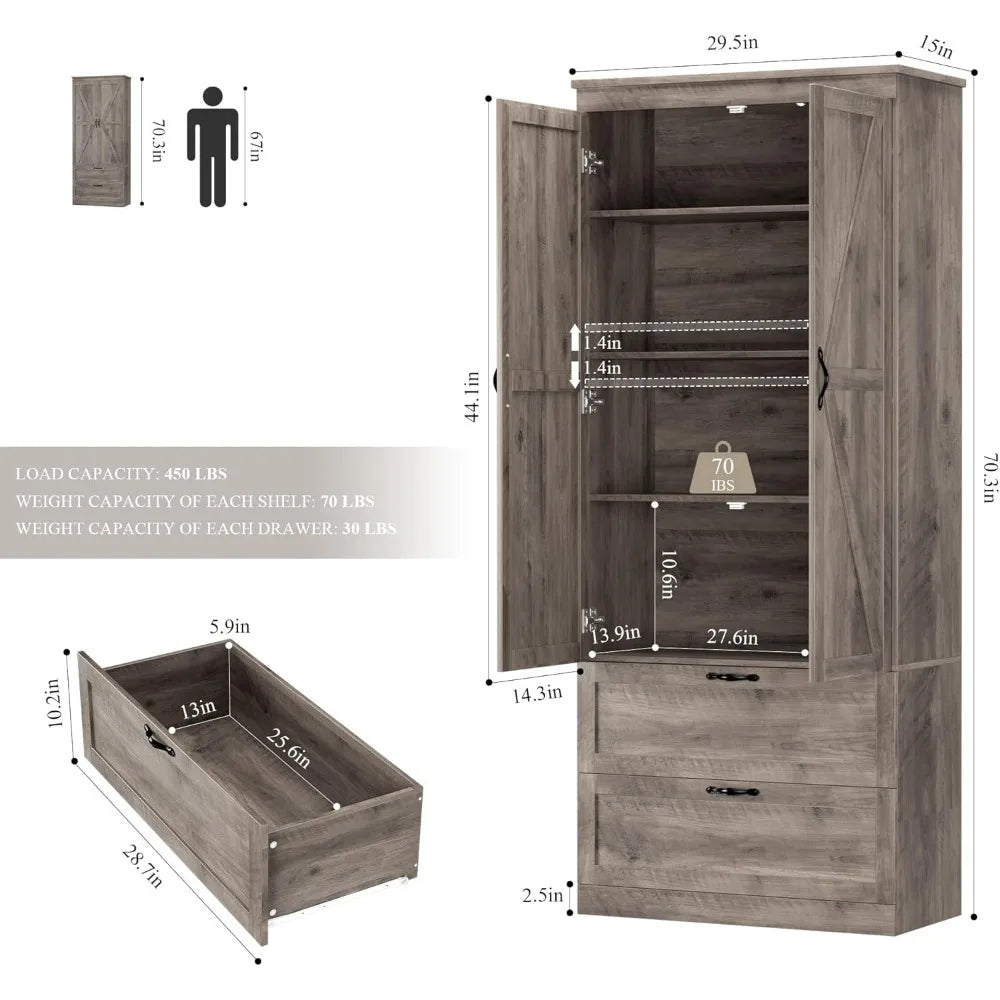 This item is a spacious storage cabinet designed to accommodate a variety of items in different sizes. It features a large double-door cabinet with two fixed shelves and an adjustable shelf, allowing for customization of storage space. Additionally, it includes two large drawers for extra storage needs. The cabinet's aesthetically pleasing design makes it versatile for use in various settings such as living rooms, studies, kitchens, dining rooms, and bathrooms. The cabinet has a modern farmhouse charm with a wood-like texture finish, barn-style doors, and classic black metal handles shaped like flowers, creating a warm and inviting atmosphere. It serves as an impressive focal point in any space. Constructed from high-quality manufactured wood and boasting a solid structure, this tall storage cabinet offers excellent stability and durability for long-term use. Its overall dimensions are 14.9 inches deep by 29.5 inches wide by 70.3 inches high, with a weight capacity of 450 lbs. The kitchen storage cabinet comes with detailed instructions and labeled parts, making assembly a breeze.