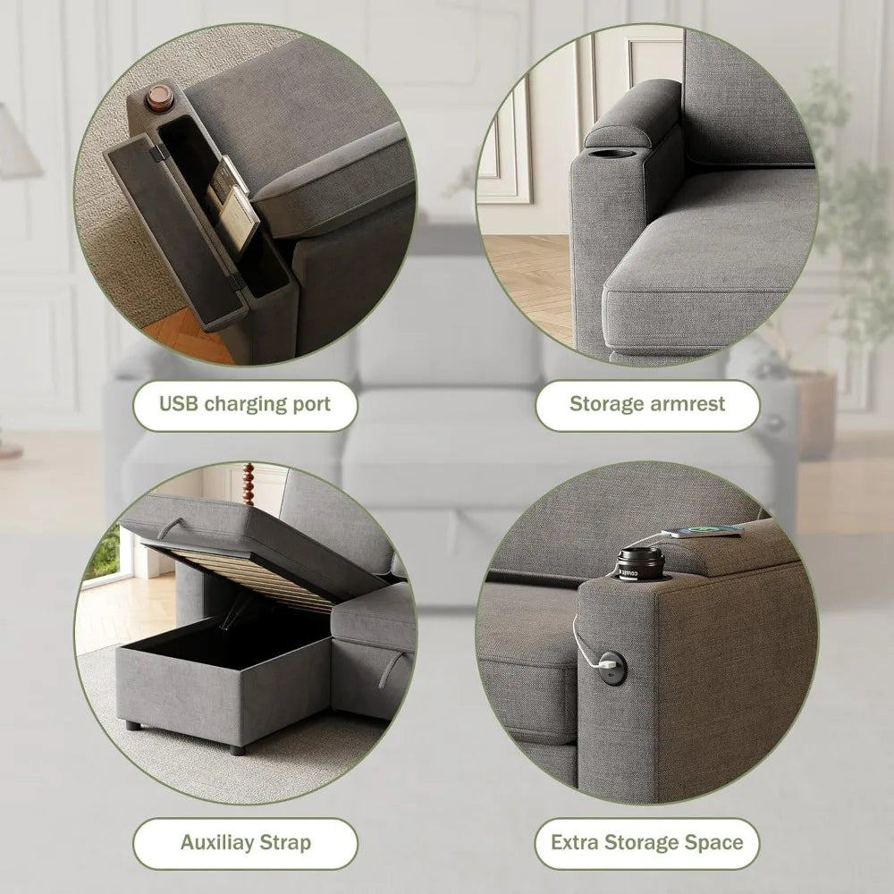 - 4-in-1 Sofa Bed: There is a hidden bed part under the couch, up pull the rope then forward pumping, you will easily get a comfortable sofa bed. This modular sofa bed can meet your different needs, and you can easily have a sofa, a sofa lounger, a sofa bed, and storage space
