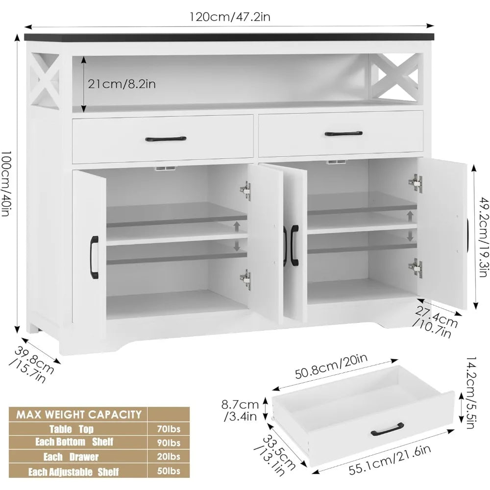 This buffet table offers a variety of storage options, including a large open compartment, a set of drawers, and four-door hidden cupboards with adjustable shelves. It's designed to keep your tableware and kitchen appliances organized, providing both open and concealed storage spaces. The table combines a farmhouse aesthetic with modern functionality and minimalist design, featuring exquisite wood grain and barn-inspired silhouettes that add rustic charm to your space while providing excellent storage solutions for your dinnerware. Made from high-grade MDF wood and premium hardware, this coffee bar cabinet is sturdy and durable, capable of supporting up to 400 lbs. Its dimensions are 15.7 inches deep by 47.2 inches wide by 40 inches high. This multi-functional storage cabinet can also serve as a console table in the hallway for displaying family photos and keepsakes, an accent storage cabinet in the living room, or even a TV stand for media devices. Assembly is straightforward, with detailed instructions and all necessary parts included, ensuring a frustration-free setup process for users of any skill level.