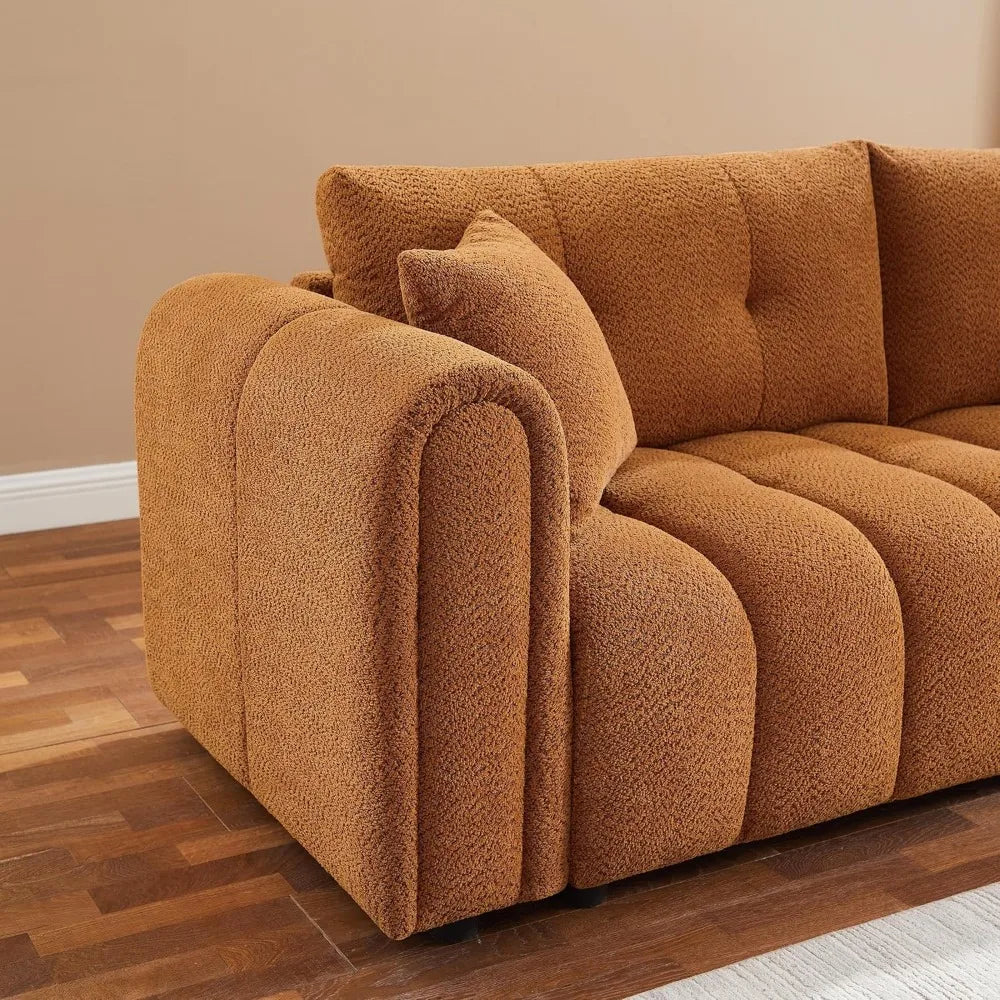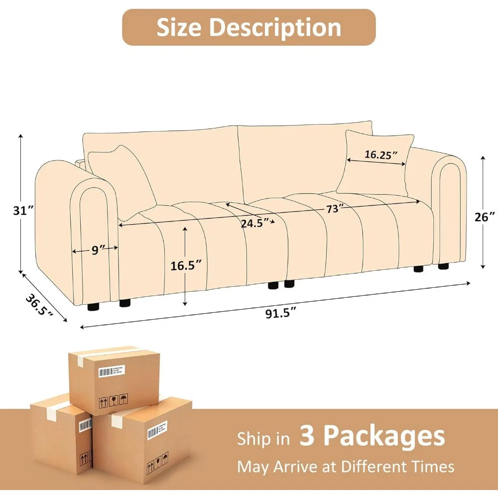 Here's a rewritten product description based on the provided information: This contemporary 3-seater sofa boasts a modern minimalist design and ample seating space, with a deep 24.5-inch seat. It's perfect for living rooms, apartments, offices, or lounges, adding a stylish touch to any space. Upholstered in high-quality boucle fabric, this mid-century modern couch offers durability, softness, and comfort. The fabric is breathable and warm, providing an ultimate comfort experience. The high-resilience sponge filling ensures the sofa maintains its shape and provides lasting comfort and support. Built with a sturdy solid wood frame, this lounge sofa can support up to 900 pounds, ensuring stability and durability for seating three people. It's ideal for family gatherings or social events, allowing you to relax and enjoy every moment with confidence. Designed according to ergonomic principles, this modern sofa conforms perfectly to your body contours, offering necessary support for your spine, shoulders, and back. It effectively relieves pressure, allowing you to fully rest and relax after a busy day. Please note that this living room cloud sofa couch will be delivered in three separate packages, which may arrive at different times and require assembly. If you have any questions regarding tracking numbers or delivery status, we're here to help. If you're not satisfied with the product, feel free to reach out to us.