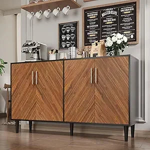This buffet cabinet is designed to provide ample storage space, helping you keep your home clutter-free. It's perfect for storing dishes, pantry items, or kitchen gadgets, ensuring everything has its designated place. The cabinet features adjustable shelves, allowing for flexible organization to accommodate tall bottles, stacked dishes, or coffee machines, showcasing its versatility. With its sleek modern design, this cabinet enhances any room with its rich wood grain doors and black frame, blending contemporary elegance with practicality. It serves as an eye-catching addition to any decor. This multi-purpose cabinet is not just for the dining area; it can also be used to create a chic coffee station or add storage to your living room, stylishly meeting every need. Built with durability in mind, this buffet sideboard cabinet is crafted from sturdy engineered wood and supported by stable legs, ensuring long-lasting performance for daily use in busy households.