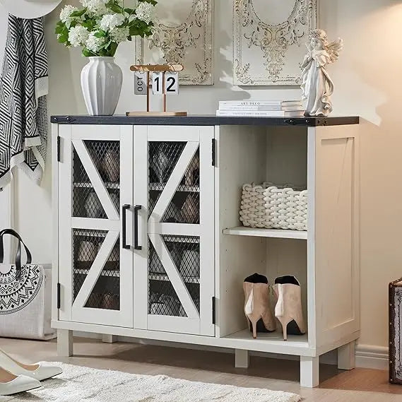 Farmhouse Style Shoe Storage Cabinet, 38 Wide with Mesh Doors and Adjustable Shelves, Rustic Wooden Shoe Organizer