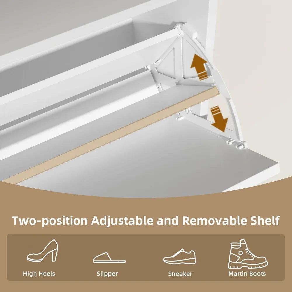 This shoe cabinet is designed for efficient storage, featuring 4 flip drawers with dual-layered compartments for ample space to organize shoes and home decor items. The adjustable shelves can be placed in two different grooves or removed, accommodating various shoe types and sizes, from flat shoes to high heels. The cabinet's flip drawer design is space-efficient and easy to operate, offering a practical solution compared to traditional shoe racks. It's perfect for narrow spaces, keeping shoes dust-free and away from pets, while maintaining a tidy entrance area. Versatile and stylish, this freestanding shoe cabinet can be placed in various locations such as the entryway, hallway, living room, or porch. Its design ensures a sophisticated and organized storage solution that enhances the aesthetic of any space. The shoe cabinet boasts a stable structure with an anti-tipping device that can be attached to the wall for added safety, especially for households with children. Constructed from high-quality MDF wood, it offers superior load-bearing capacity. Assembly is straightforward, with dimensions of 40.1 inches wide, 9.4 inches deep, and 37.8 inches high. All necessary accessories and clear instructions are included. Should you have any assembly queries, our customer service is ready to assist you with solutions.