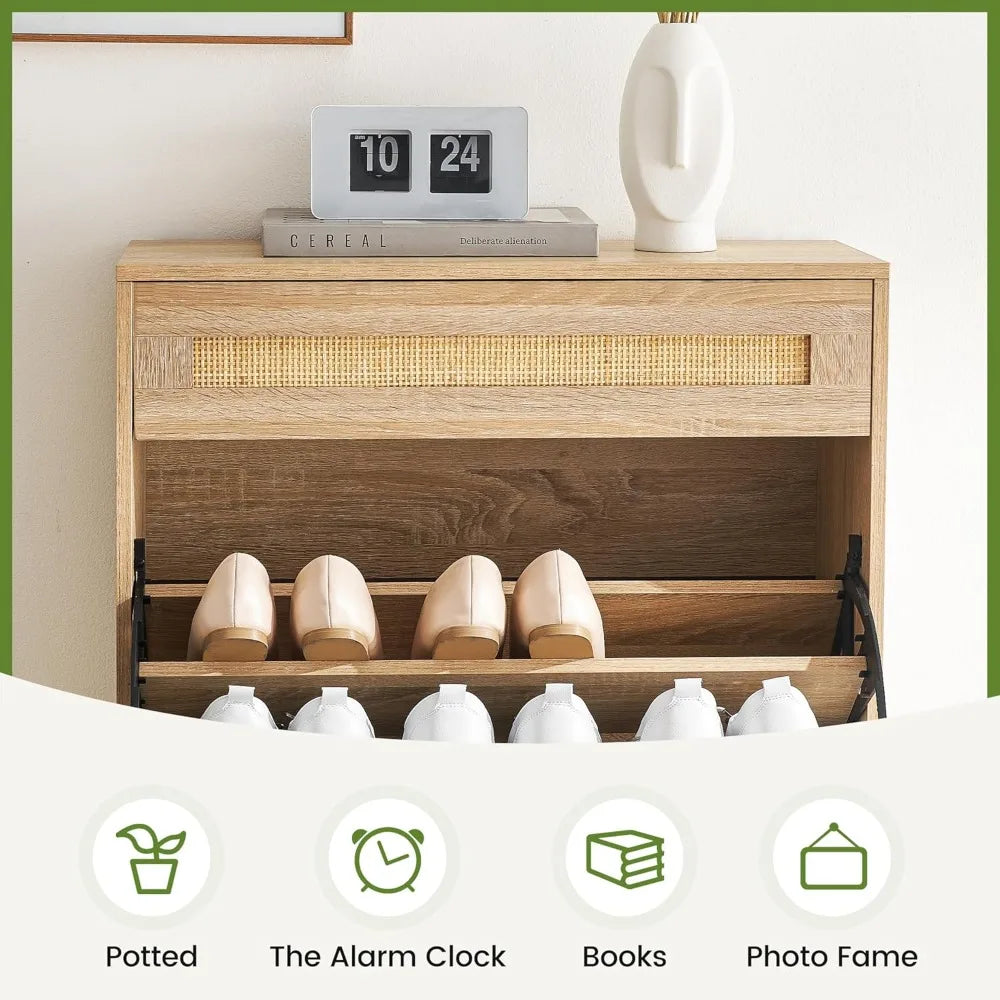 Freestanding Rattan Shoe Organizer with Dual Flip Drawers and Single Drawer for Entryway Storage