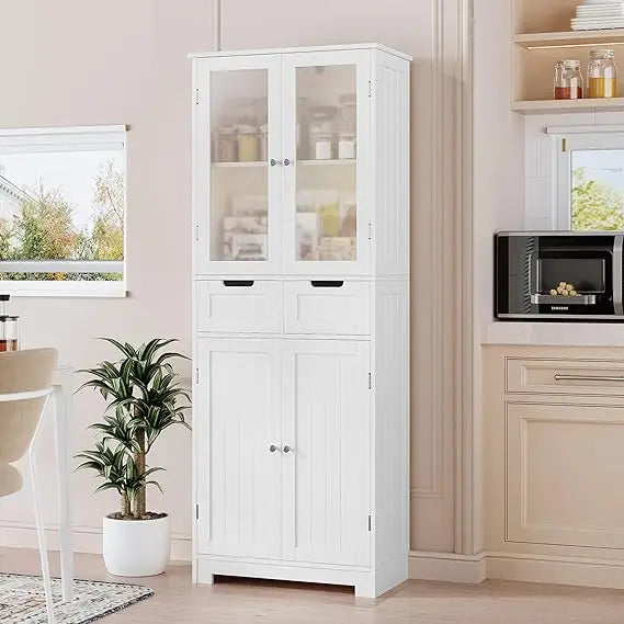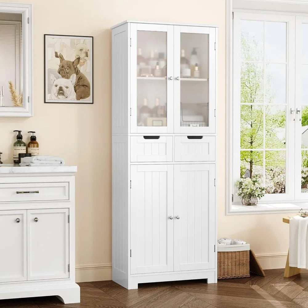Freestanding Tall Storage Cabinet with Drawers and Glass Doors for Kitchen and Bathroom