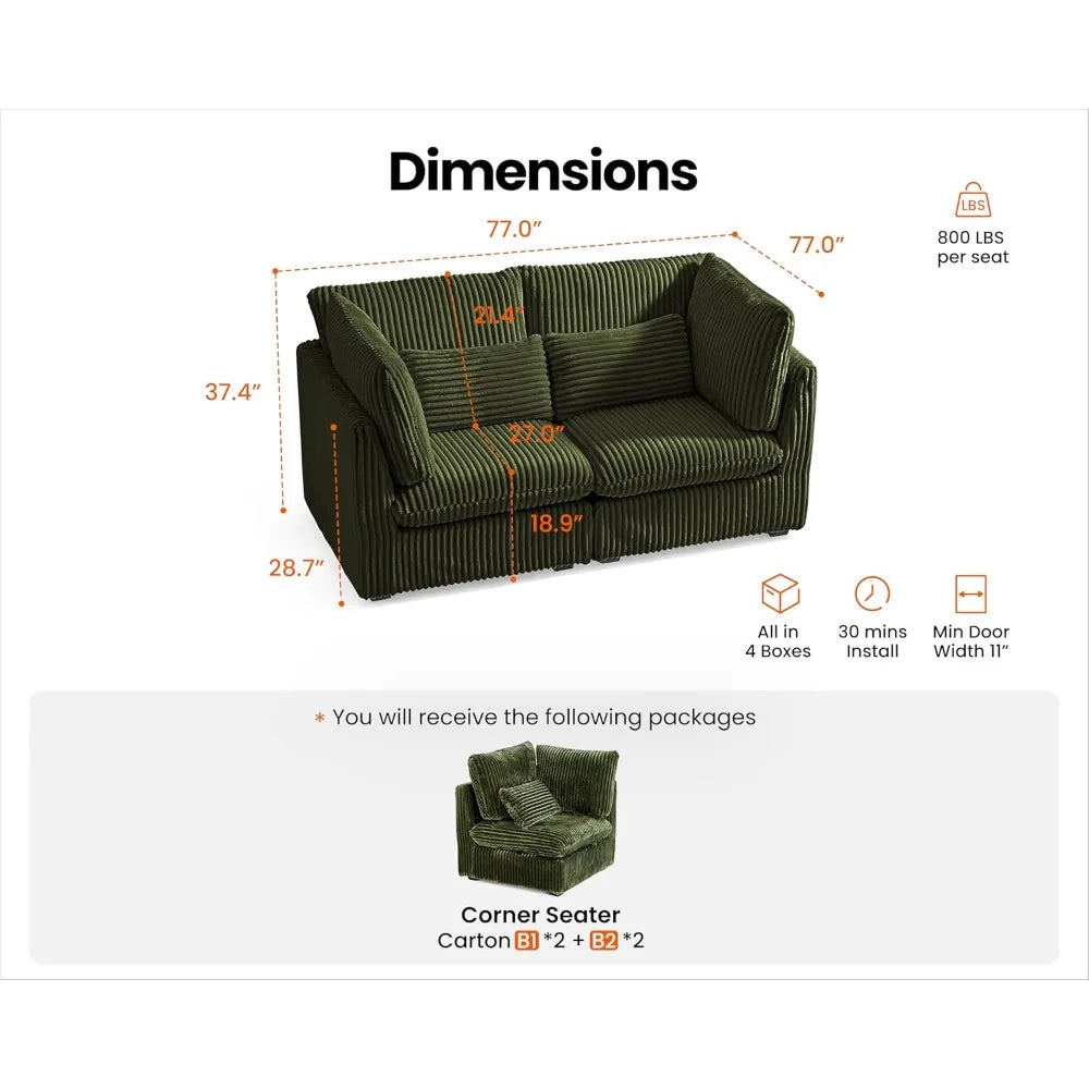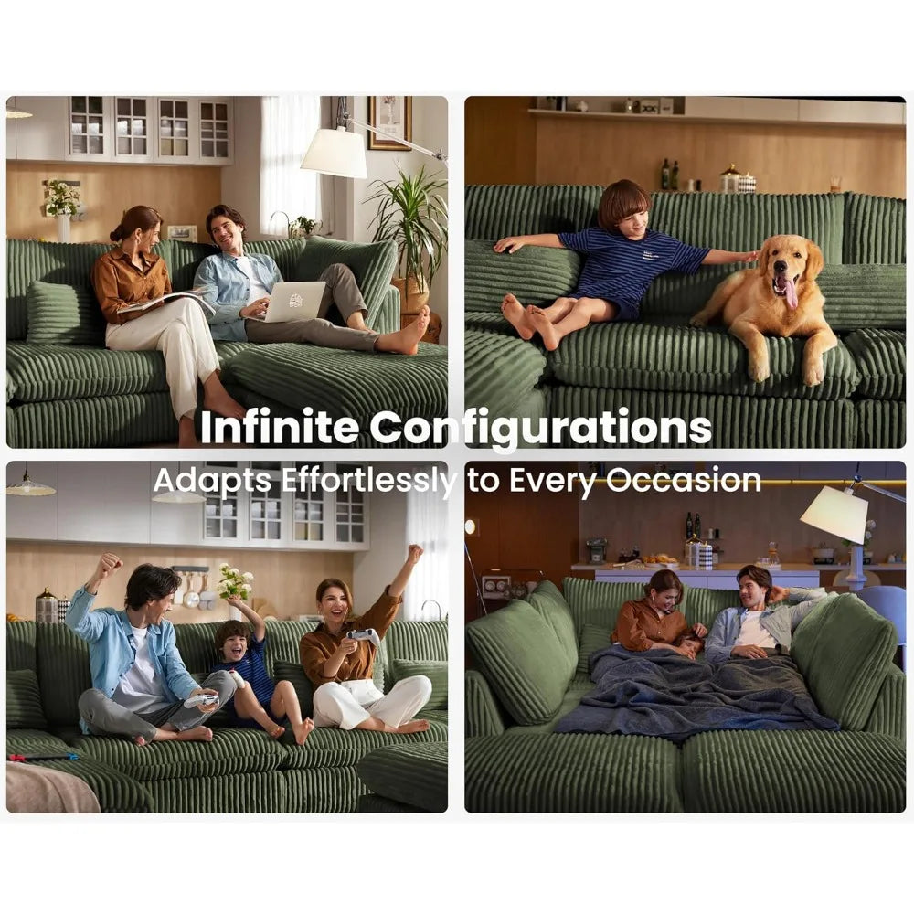 This item features an oversized and extra-wide seating area, providing a deep and comfortable experience. With a seat depth of 27 inches, it is 16.75 to 20% deeper than most sofas, and a width of 38.5 inches, making it 10 to 29.7% wider than typical couches. The sofa is designed with high-density foam, soft corduroy, and tightly woven chenille fabric, offering a perfect blend of softness and firm support. It's ideal for both relaxation and focus, transforming every moment into pure comfort. The sectional's modular design allows for endless configurations, making it easy to transform your space. Whether you need an L-shape for movie nights, a U-shape, or a spacious sleeper for entertaining, this sectional can be reconfigured to fit your needs. It's perfect for living rooms, home offices, or entertainment spaces, offering customizable comfort without the need for complicated tools. Enjoy seamless reconfiguration for various activities. Assembly is a breeze with this tool-free design. The modular design uses high-quality U-shaped stainless steel connectors for a secure fit between each module, allowing for quick and easy setup. You can enjoy your sectional in as little as 20 minutes, making it perfect for those who value convenience and flexibility. Durability is key with this sectional, built to last with a strong hardwood frame and high-density foam cushions. It's perfect for families, pet owners, and anyone who needs furniture that can handle daily wear and tear. This modular sectional retains its shape even with constant use, providing peace of mind and long-lasting comfort. The sleek, modern design of this sectional complements any decor with its minimalist and elegant appearance. It suits both contemporary and traditional interiors, adding a touch of sophistication to your living space. The neutral tones and durable, pet-friendly fabric make it easy to maintain, enhancing your space without compromise. For your convenience, the sectional is shipped in four packages, allowing for easier handling and assembly. Each package is carefully packed for safe transit, and our professional customer service is ready to assist you with any concerns. The thoughtful design ensures a simpler and more efficient setup process, so you can enjoy your sectional without any hassle.