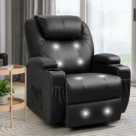 This product features a reclining sofa that comes in two separate parcels, which may arrive at different times. For any inquiries after receiving the package, you can reach out to our dedicated customer service and technical support team. The remote controls are conveniently placed in a small box under the chair bottom. The sofa is designed for ultimate comfort, with a sturdy faux leather surface that gives it a sleek and elegant appearance. It is filled with fluffy padding for a soft feel, ensuring you won't experience any hardness. The base of the sofa is made from sturdy metal, providing a swivel base that can support significant weight. In addition to its comfort, the sofa boasts a vibration massage function, offering an 8-point massage, three levels of vibration intensity, and three modes of adjustment. When the footrest is extended and the lumbar support is lowered, you can activate these features for a personalized relaxation experience. The sofa also offers practical functionality with a 140-degree lie-down feature to reduce back pressure, a 360-degree rotation for easy direction changes, and a 30-degree rocking motion for enhanced relaxation. For added convenience, the recliner includes four side pockets to hold items such as a remote control, cell phone, and books, as well as two cup holders to keep your drinks within reach and your hands free.