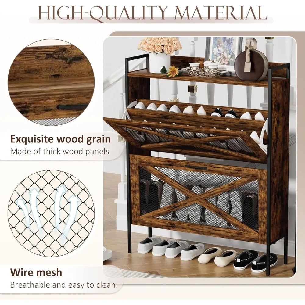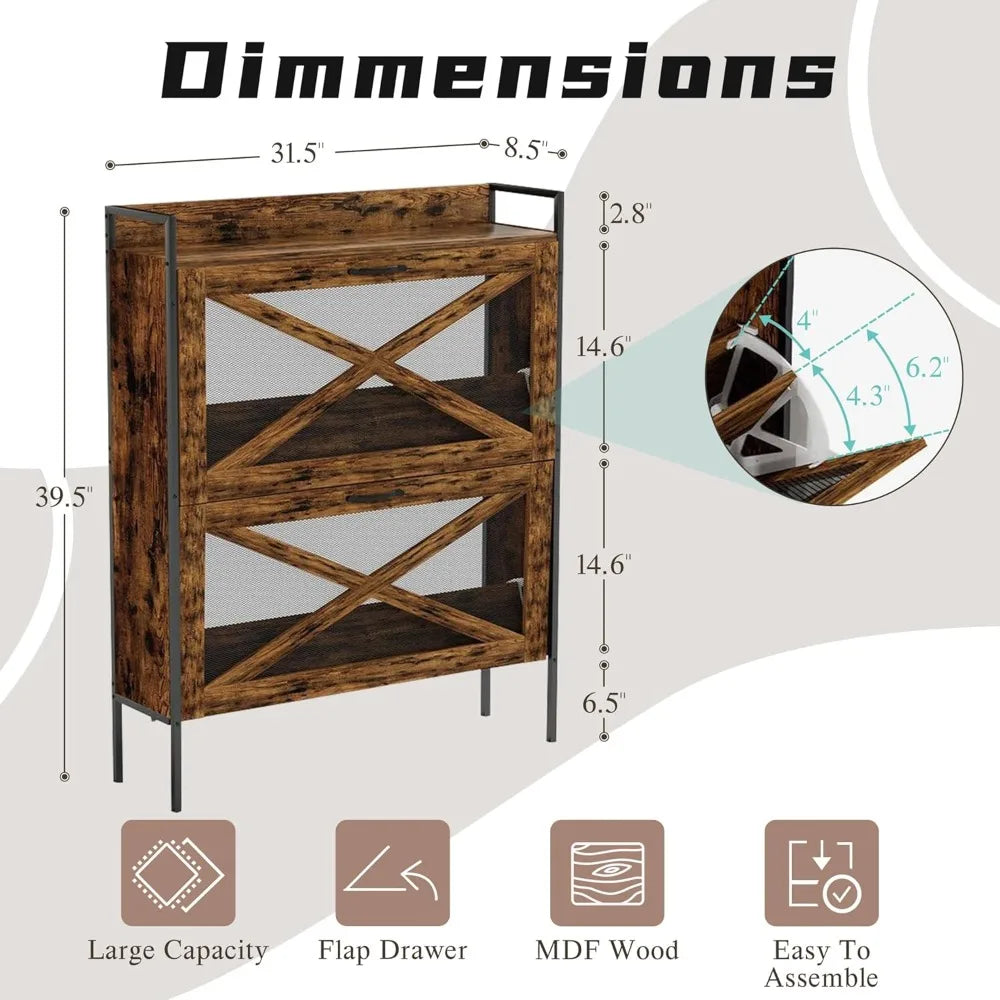 Rustic Brown Slim Shoe Cabinet with Two Drawers for Closet, Entryway, and Living Room - Narrow Storage Solution