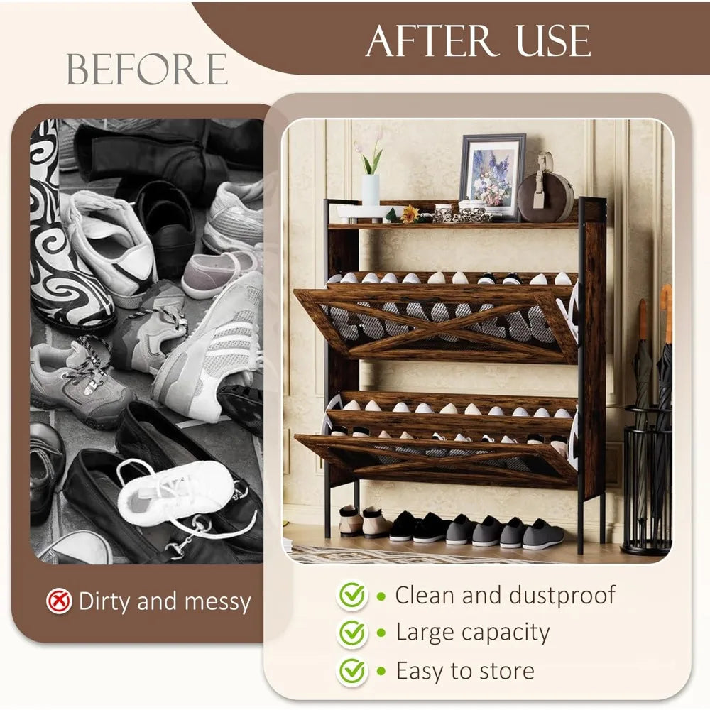 This shoe organizer is designed with a slim and stylish look, making it perfect for fitting into tight spaces in your living room or entryway. Its ultra-thin design allows for maximum space utilization while maintaining a modern aesthetic. The two-drawer shoe storage cabinet provides ample room for organizing your shoes and can be used at the front door or in hallways. It is also an ideal space-saving solution for entryway storage, blending seamlessly with contemporary decor. Made from durable wood, this shoe rack organizer offers long-lasting storage for shoes, bags, or accessories, and is compact enough for any entryway cabinet. Its versatile design allows it to be used as a shoe organizer in entryways, hallways, or closets, enhancing the space with its sleek look while keeping clutter at bay.
