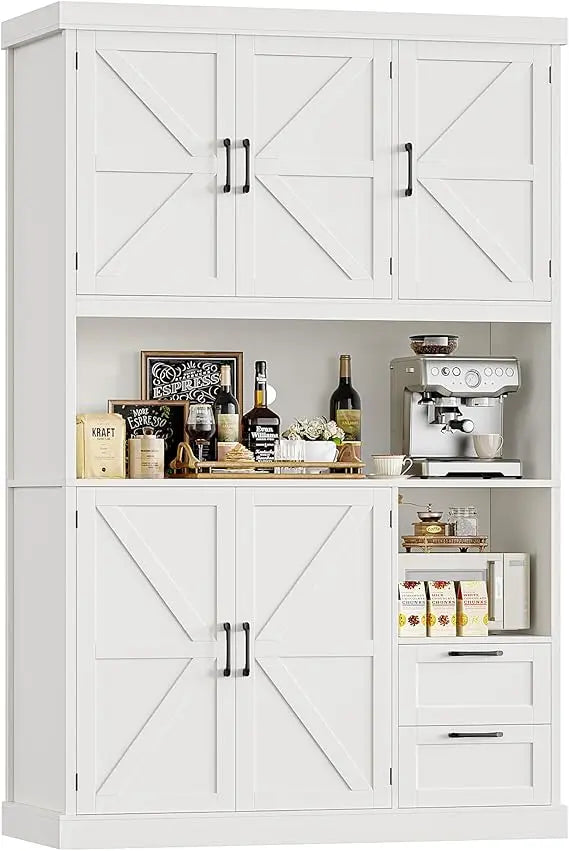 This kitchen pantry cabinet offers ample storage solutions with its two smooth-gliding drawers, a 45-inch wide microwave stand, an open compartment, and five door cabinets with built-in shelves. It's designed to keep your dining essentials organized and your living space clutter-free. The cabinet features a charming farmhouse style with a handcrafted appearance, retro wood paneling, and distinctive X-patterned doors, adding a rustic touch to your home. Measuring 15.8 inches deep, 47.24 inches wide, and 76 inches high, it's a spacious addition to any room. Functionality is key with this storage cabinet, which can serve as a coffee bar in the living room, a console in the hallway, or a pantry in the kitchen. Its versatile design ensures that it can enhance the beauty of any corner of your home for years to come. Constructed from high-grade MDF wood and premium hardware, this cabinet is both durable and sturdy. It's tested for resistance to liquids and stains, and features an anti-tip device and a reinforced base for added stability, capable of supporting up to 650 lbs. The cabinet stands out with its tall 76-inch frame, providing significant vertical storage space. A unique feature is the fence on top of the upper hutch, which offers additional storage for plants, picnic baskets, decorative items, and other frequently used objects. This freestanding cabinet comes in two packages for easy assembly, with detailed instructions and all necessary parts included. Please ensure you receive both packages before starting the assembly process.